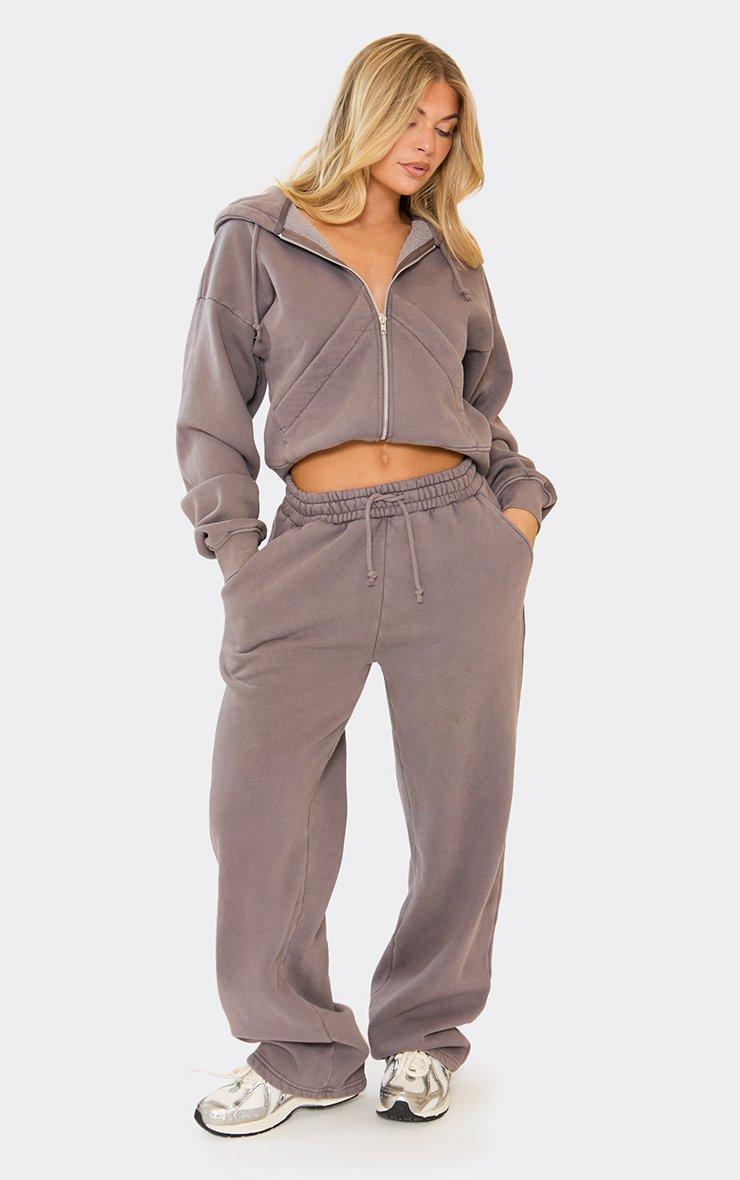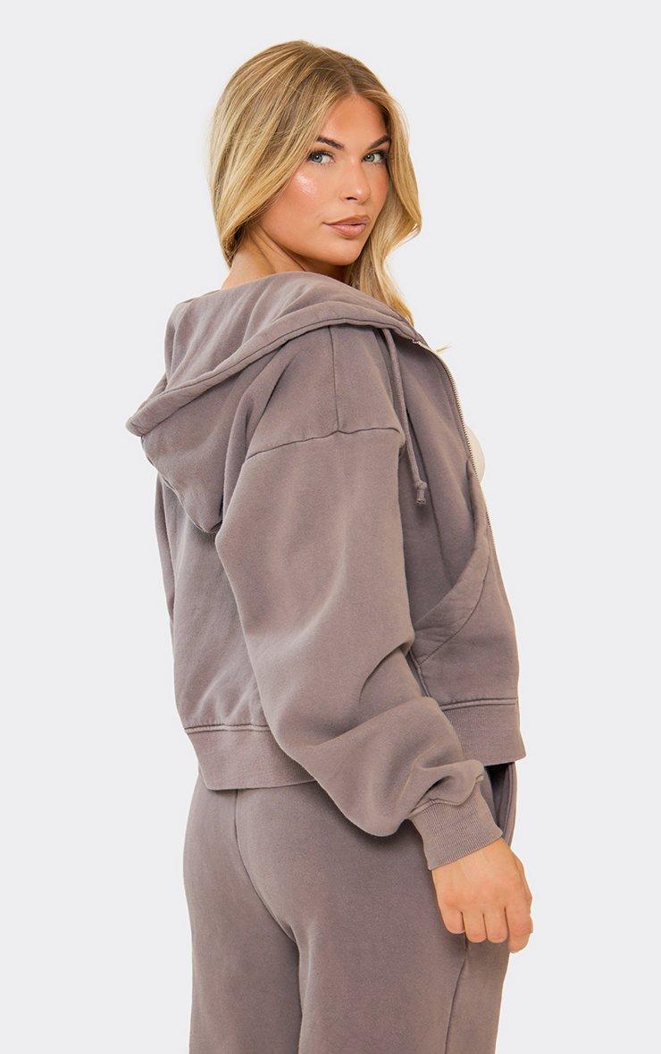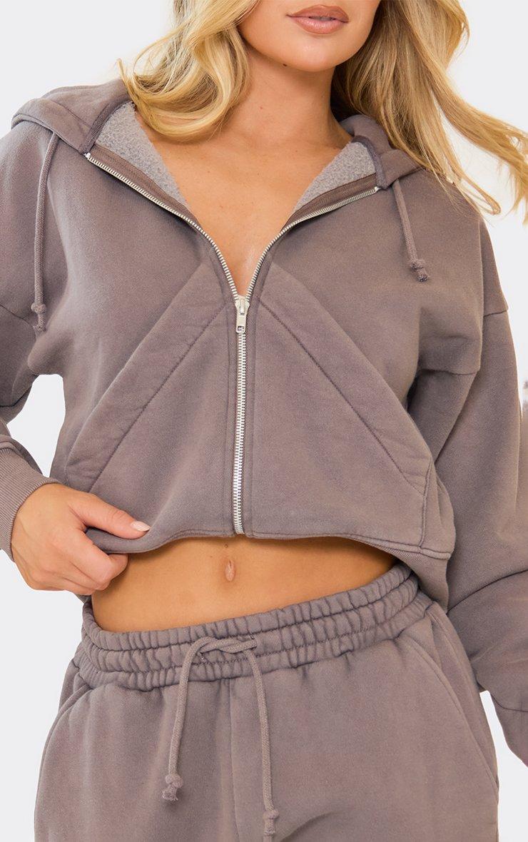 Long Sleeve Cropped Cinch Waist Zip Up Hoodie In Washed Charcoal Grey