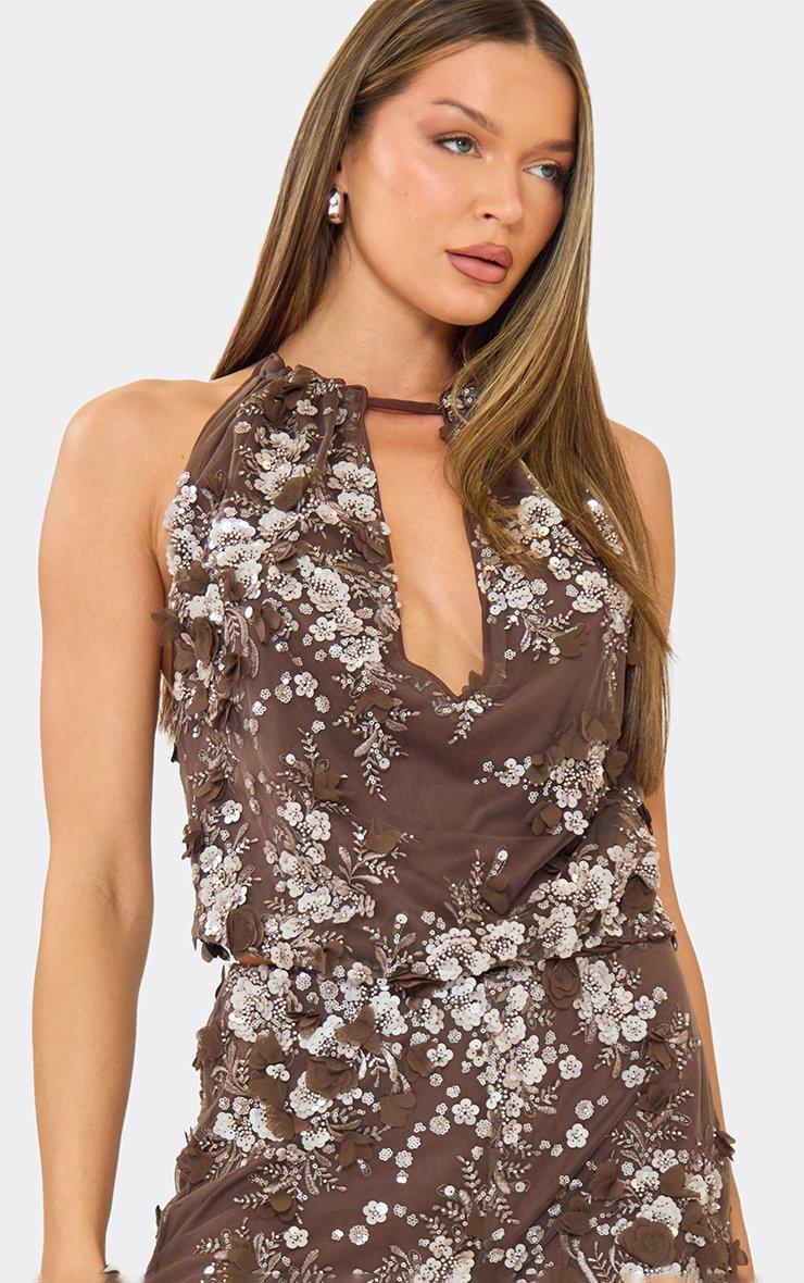 Plunge Cowl Halterneck Floral Embellished Top In Brown Sequin