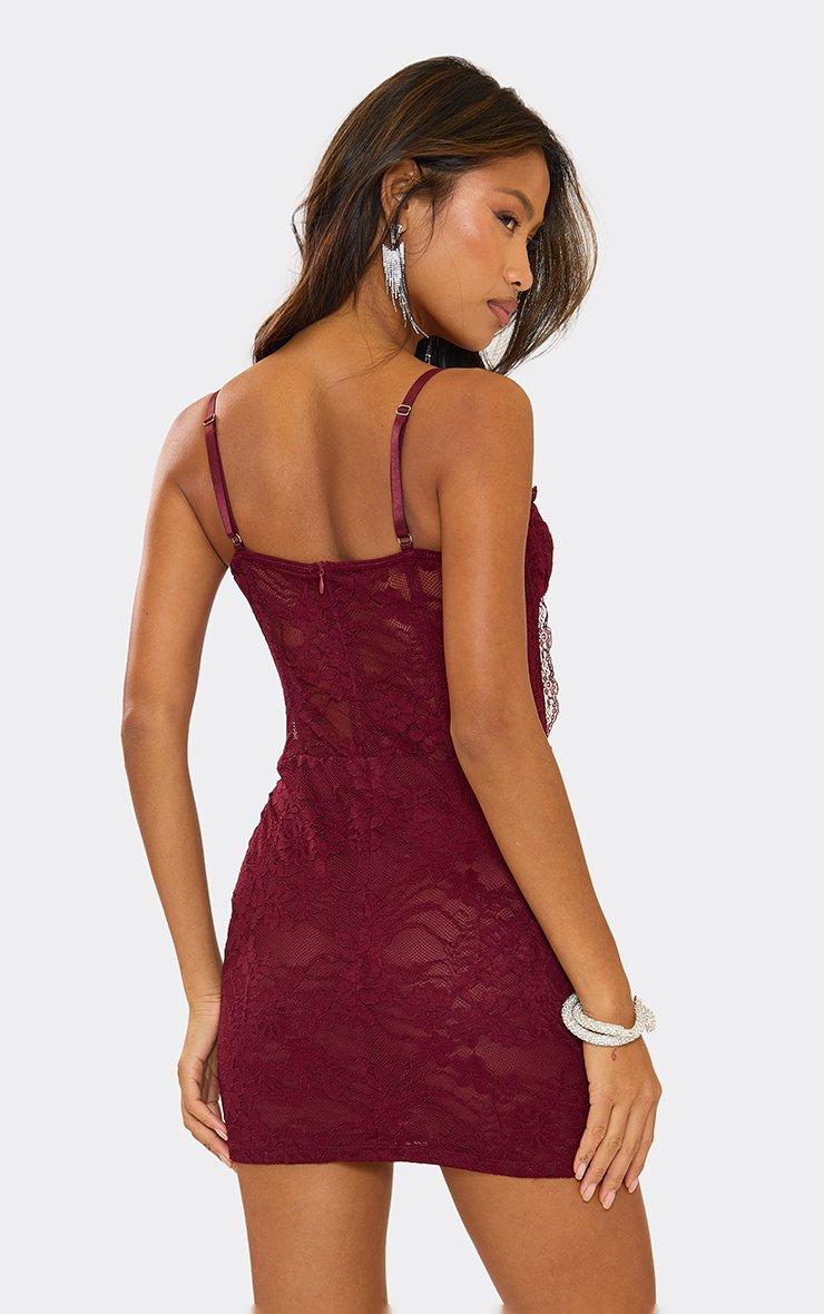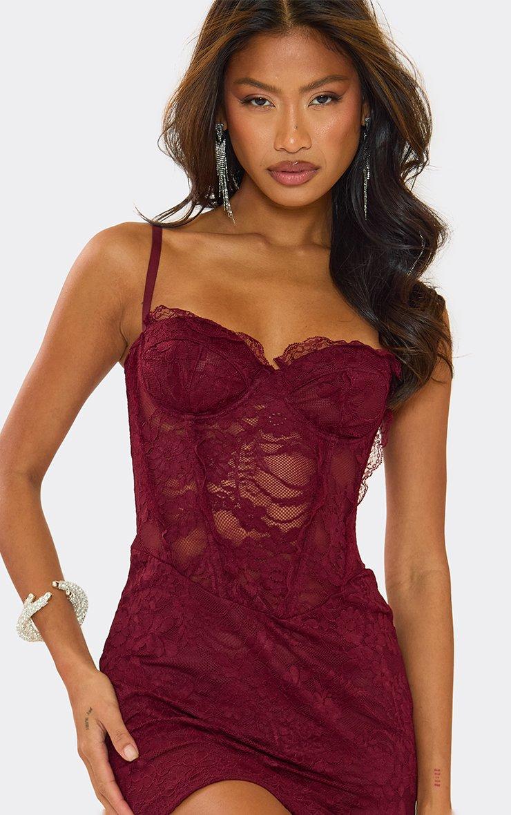 strappy underwired lace trim corset detail mini dress in burgundy