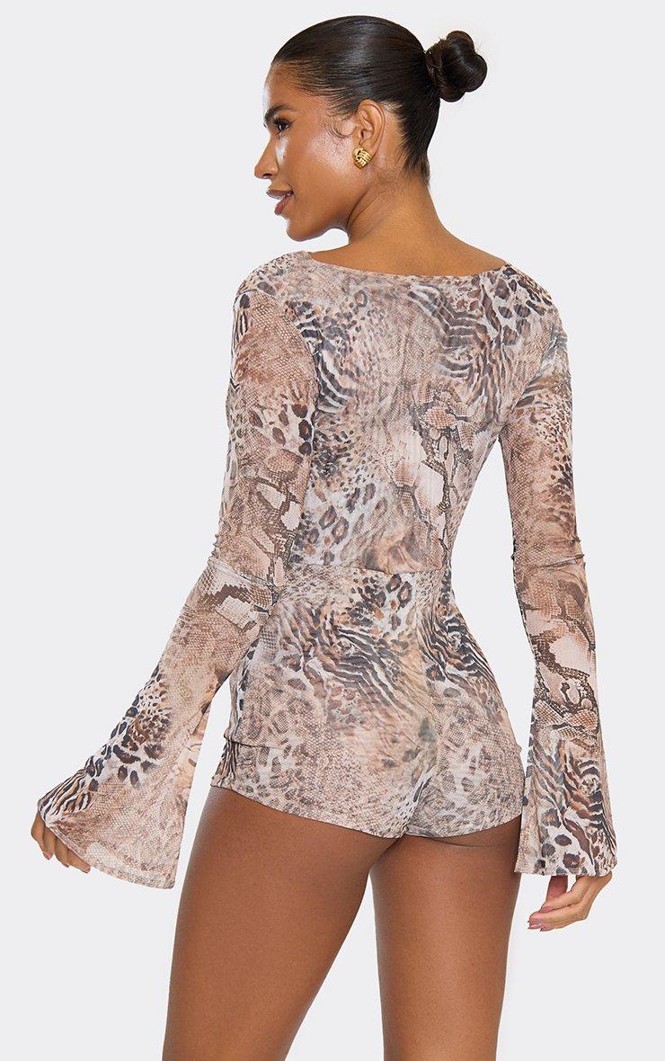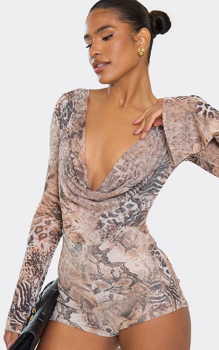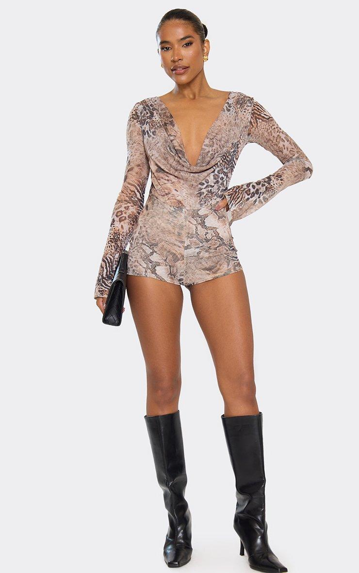 Long Sleeve Cowl Neck Detail Playsuit In Brown Animal Print