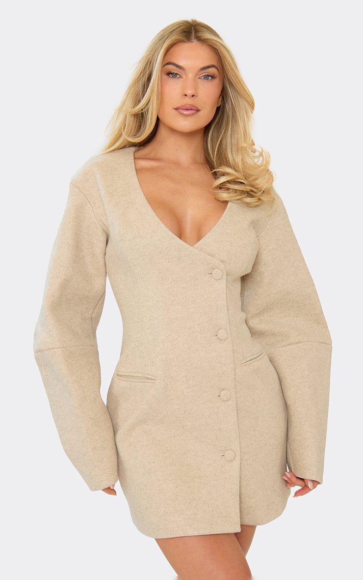 Balloon Sleeve Button Front Wool Look Blazer Dress In Beige