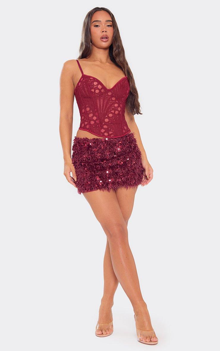 Strappy Hook And Eye Corset Top In Burgundy Velvet Lace