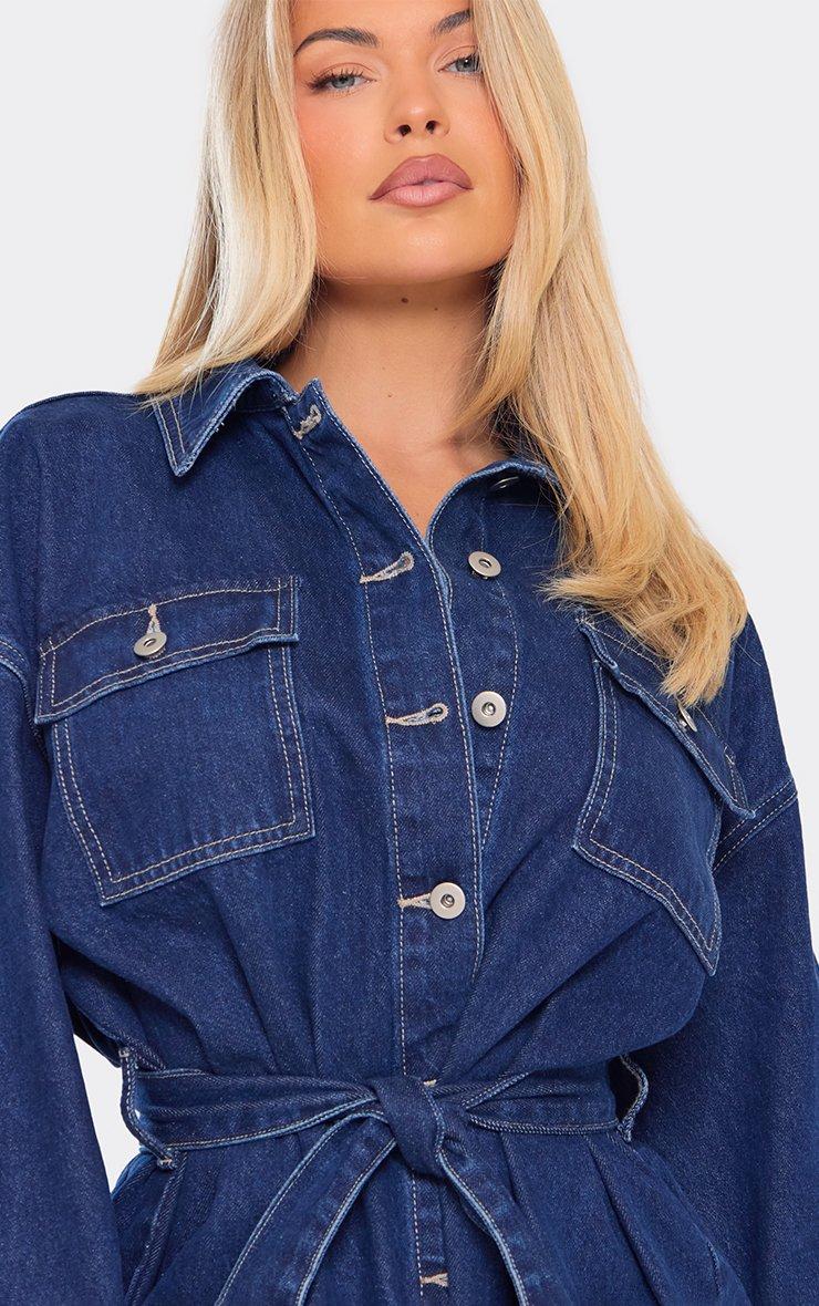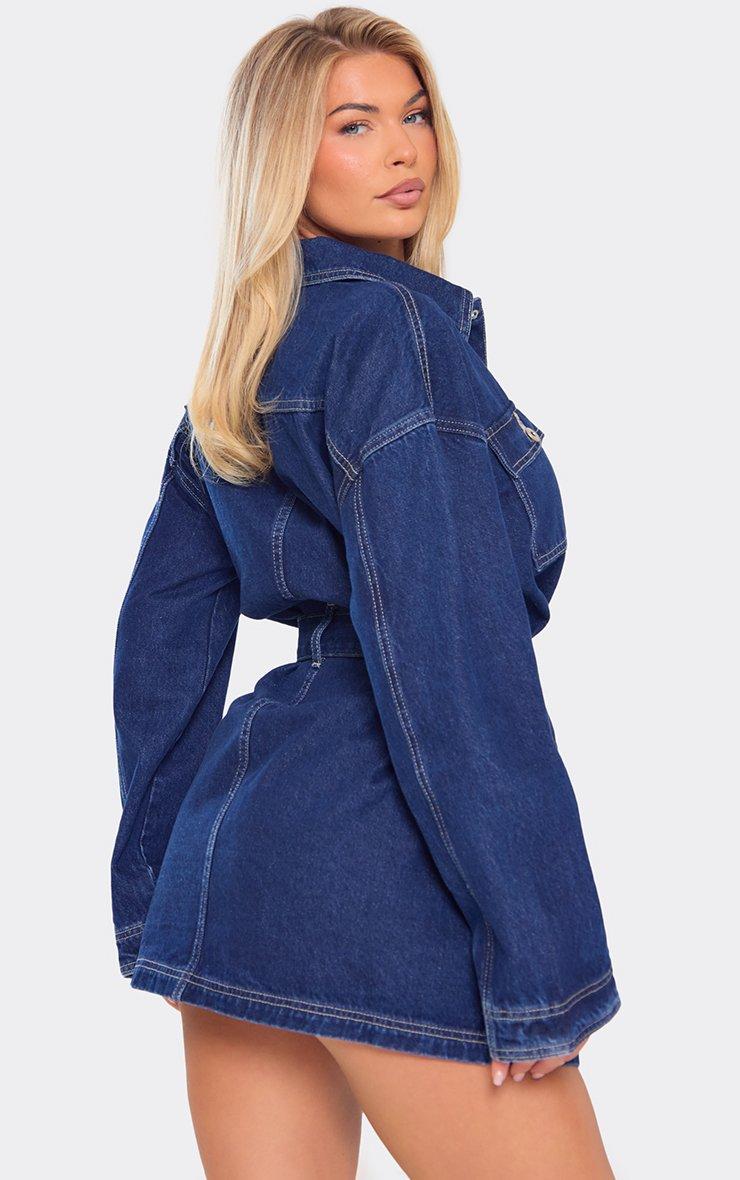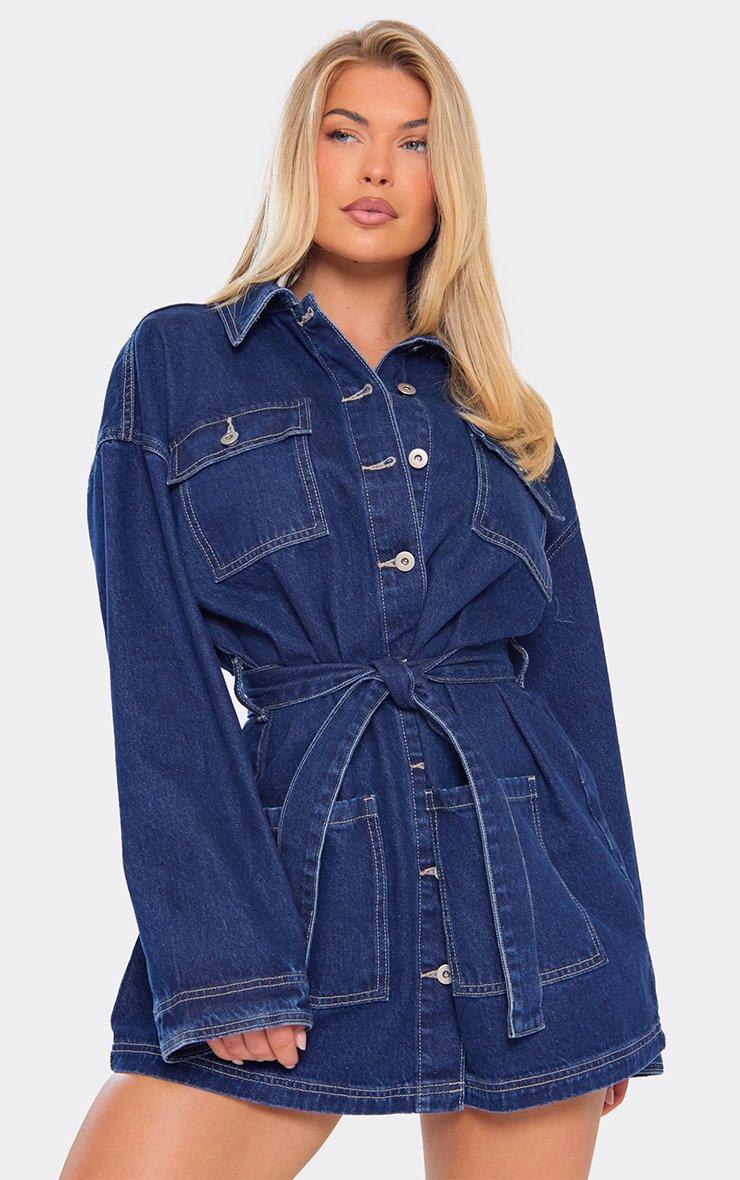 Long Sleeve Belted Button Down Mini Dress In Indigo Blue Denim