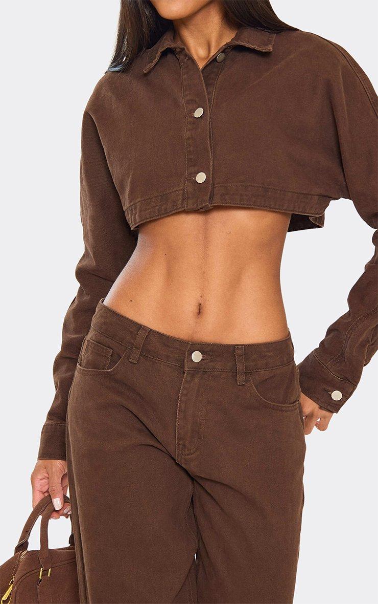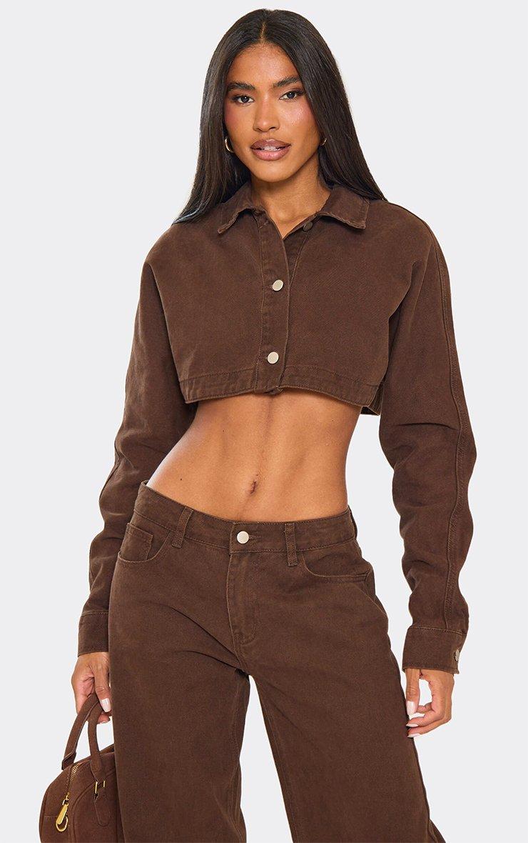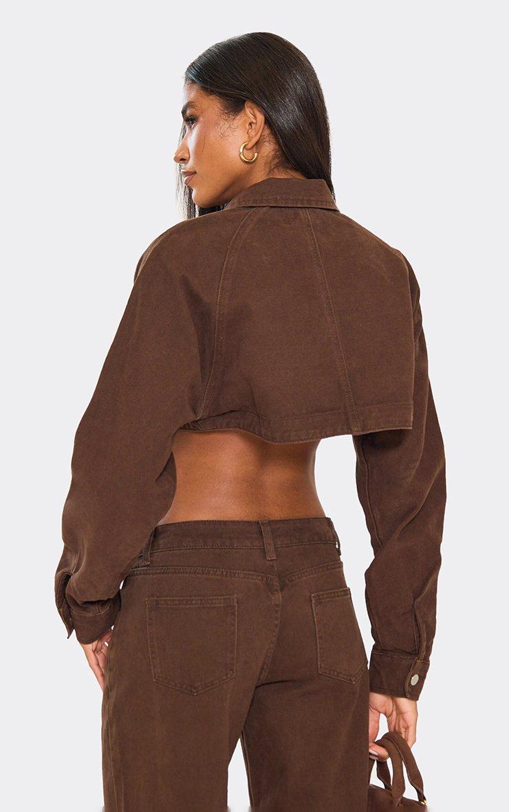 long sleeve extreme cropped jacket in chocolate brown denim