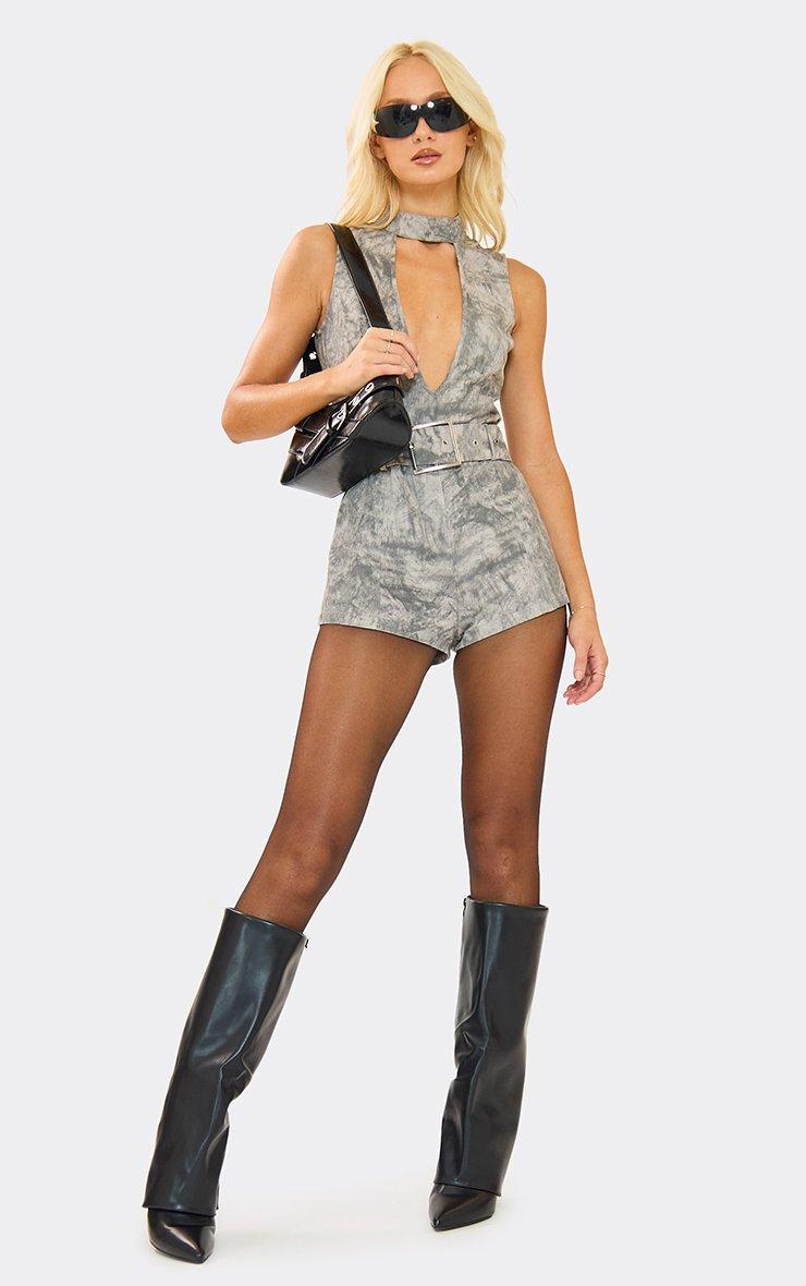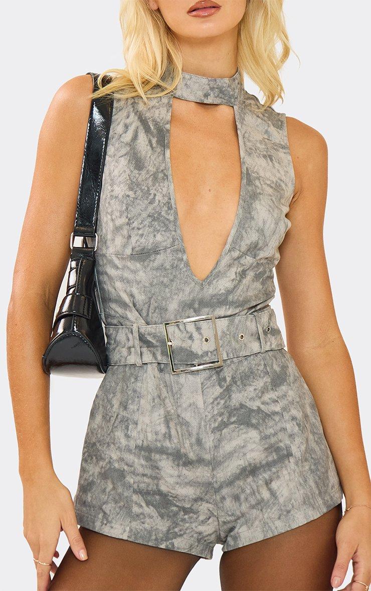 high neck keyhole cut-out belt detail playsuit in grey acid wash print