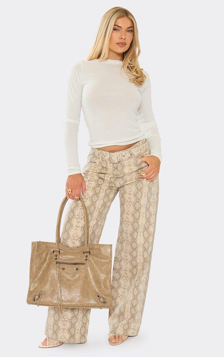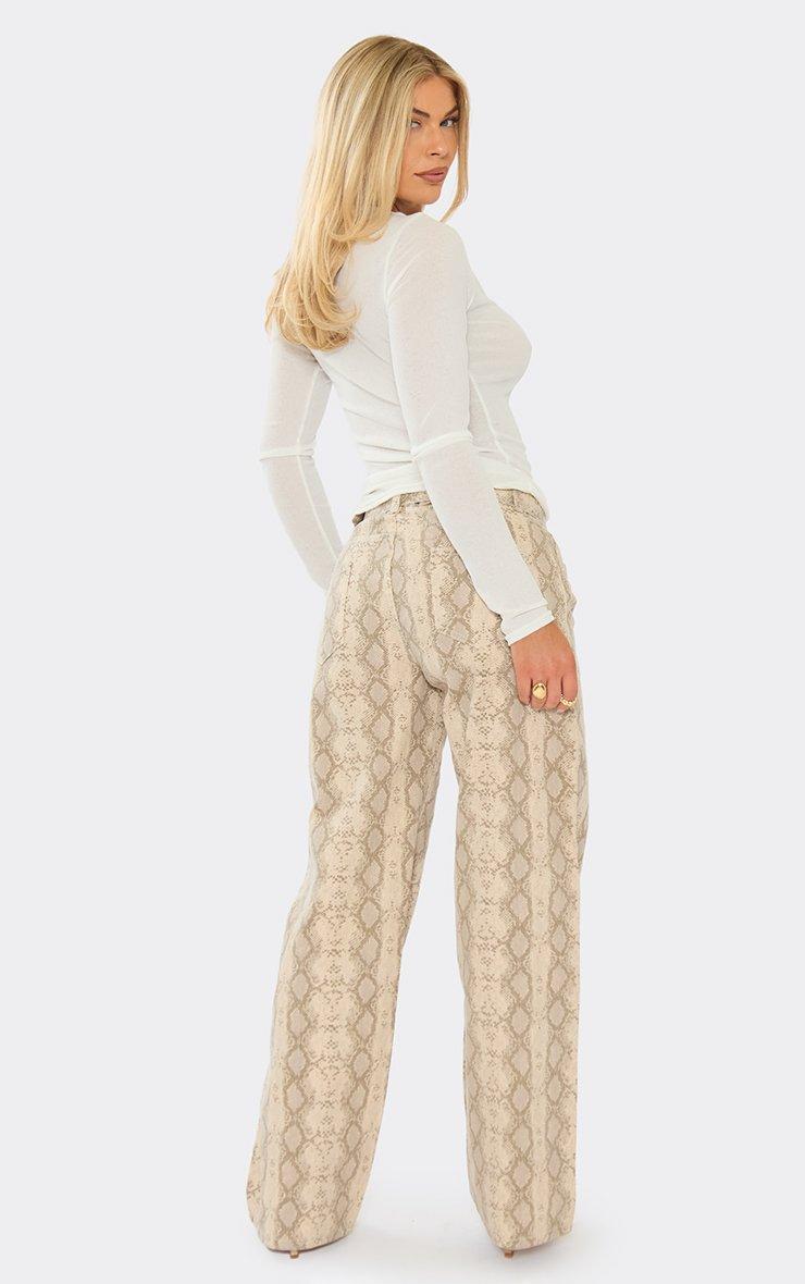 Belted Wide Leg Jeans In Brown Snake Print Denim