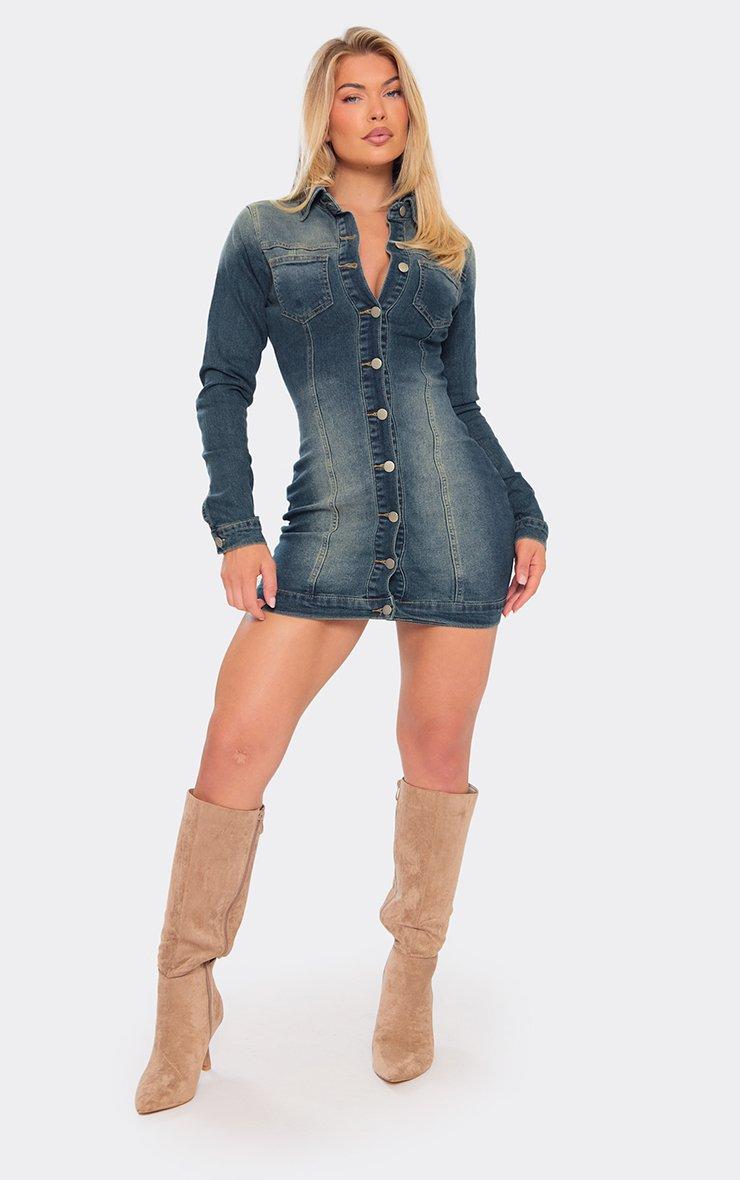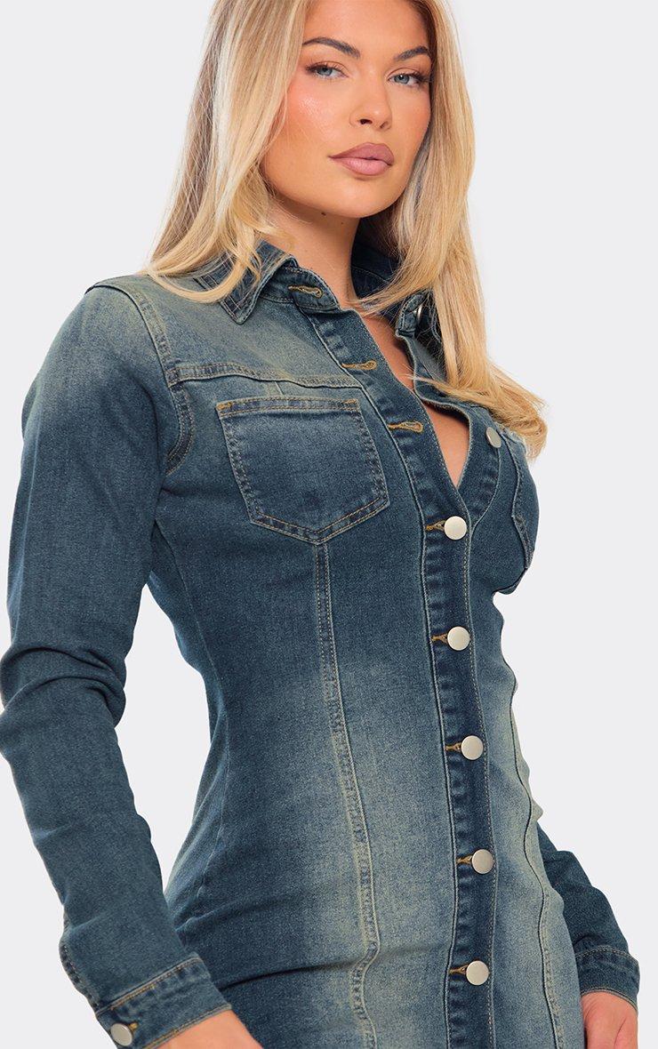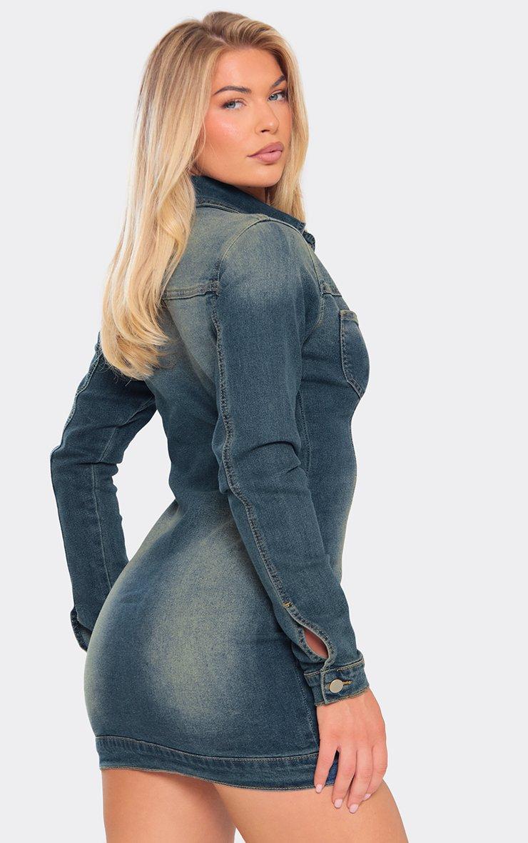 Long Sleeve Button Down Collared Detail Mini Dress In Washed Blue Denim