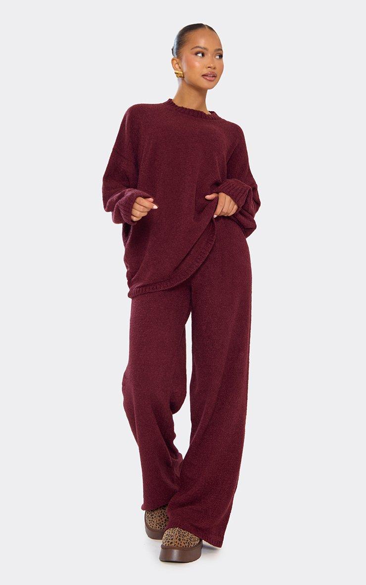 Mid Waist Ego Graphic Straight Leg Trousers In Burgundy Knit