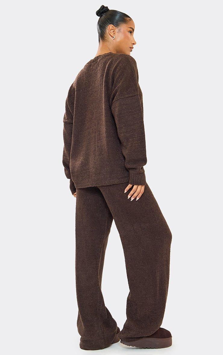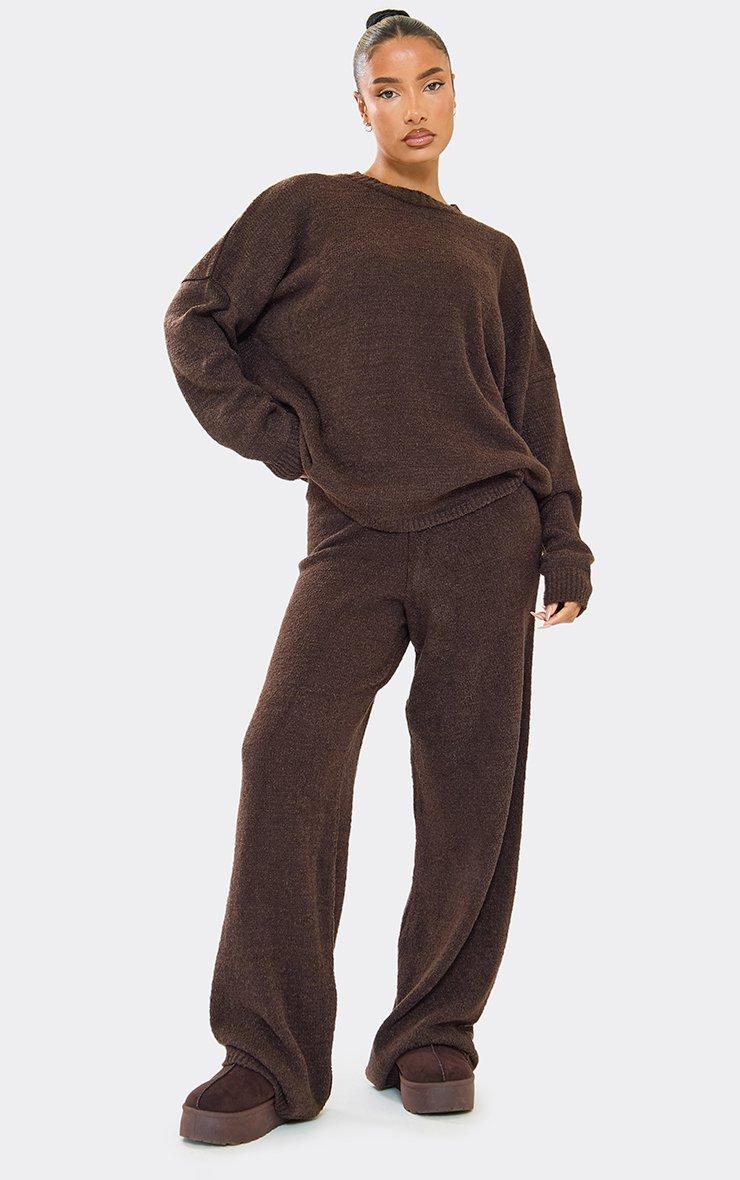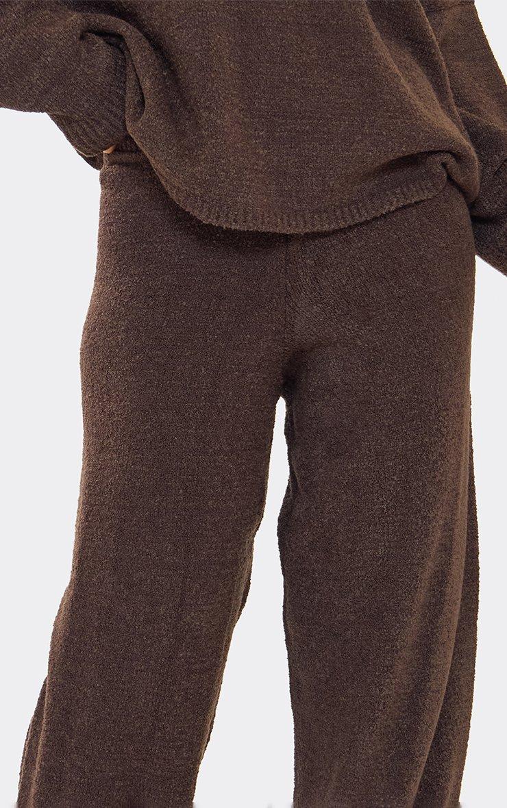 Mid Rise Wide Leg Trousers In Chocolate Brown Boucle Knit