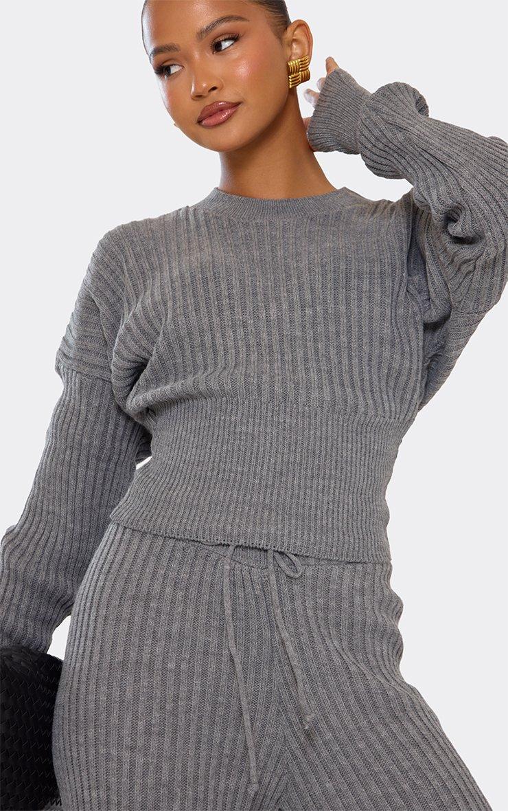 Bardot Fold Over Fitted Cropped Jumper In Grey Rib Knit.