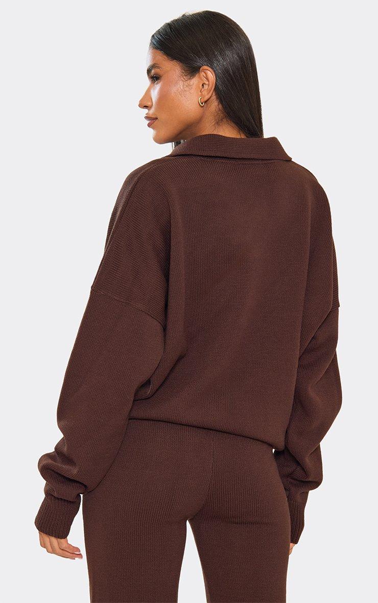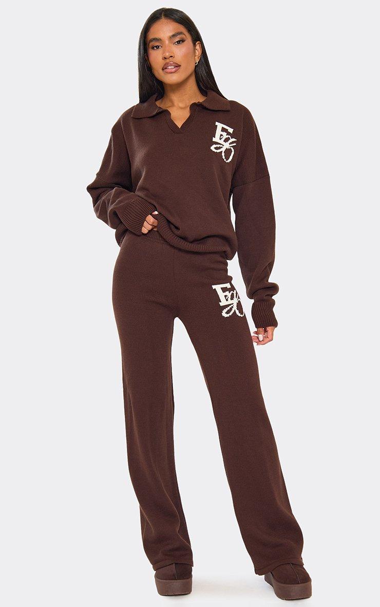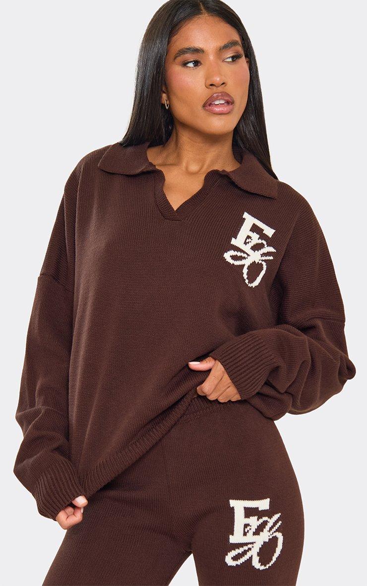 Long Sleeve Ego Graphic Collared Jumper In Chocolate Brown Knit