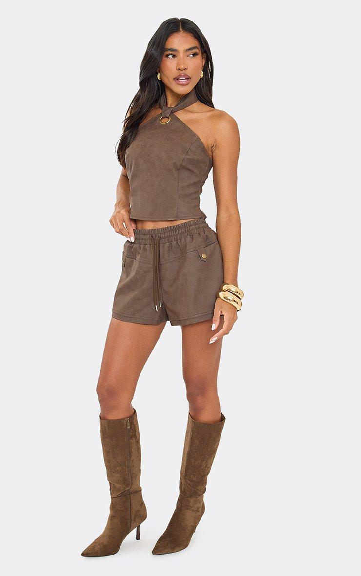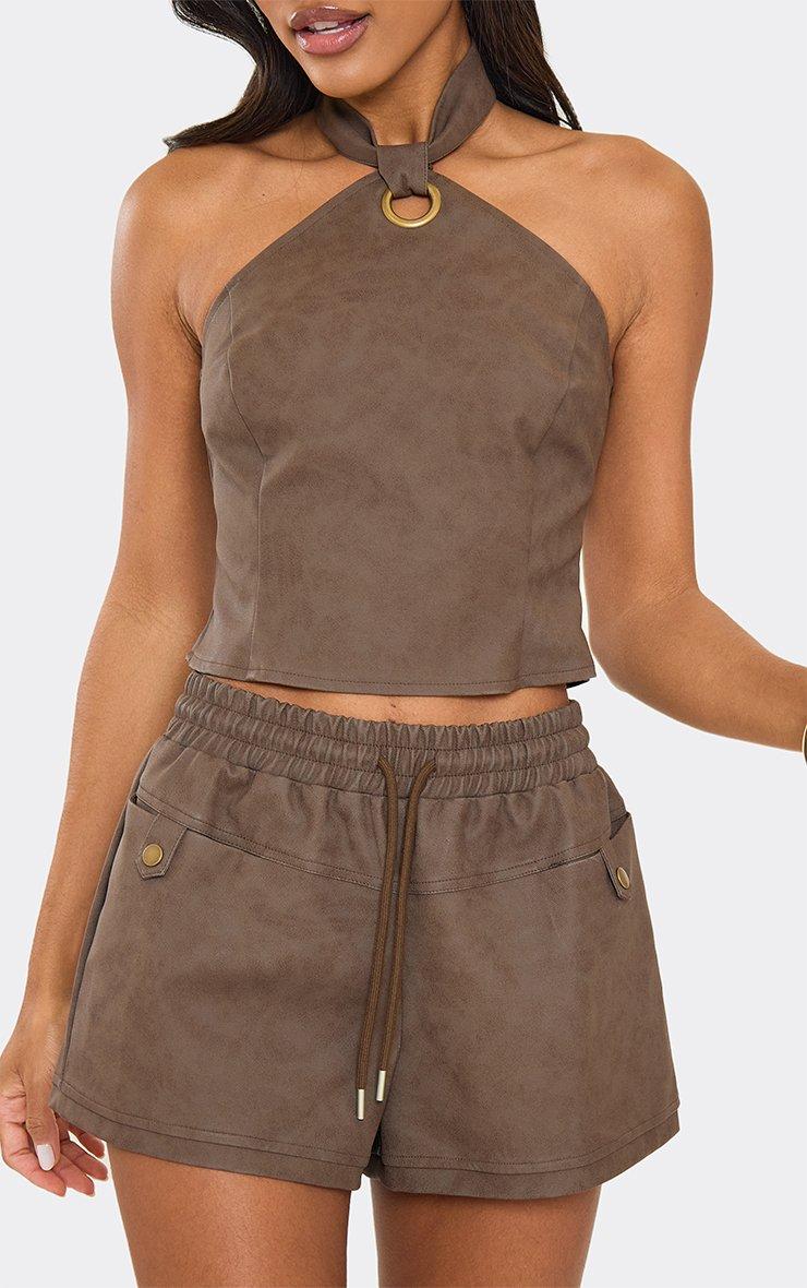 Halterneck Eyelet Detail Top In Brown Wet Look