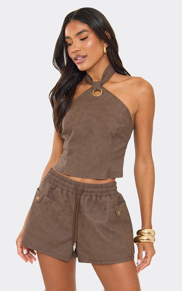 Mid Waist Tailored Hot Pants In Chocolate Brown Faux Suede