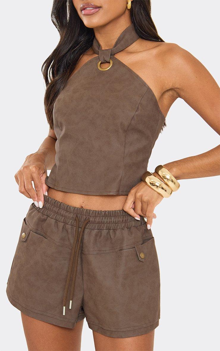 Mid Rise Belt Loop Detail Shorts In Chocolate Brown Faux Leather