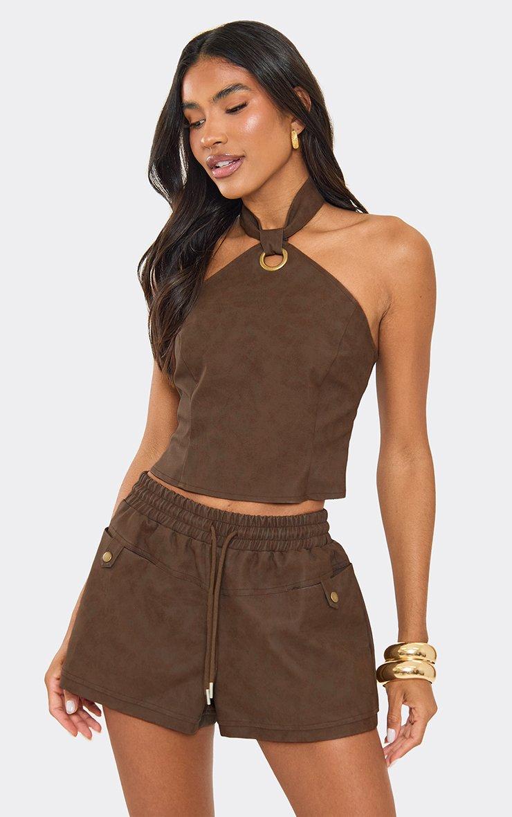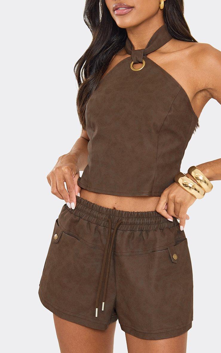 Mid Rise Drawstring Waist Detail Mini Shorts In Brown Wet Look