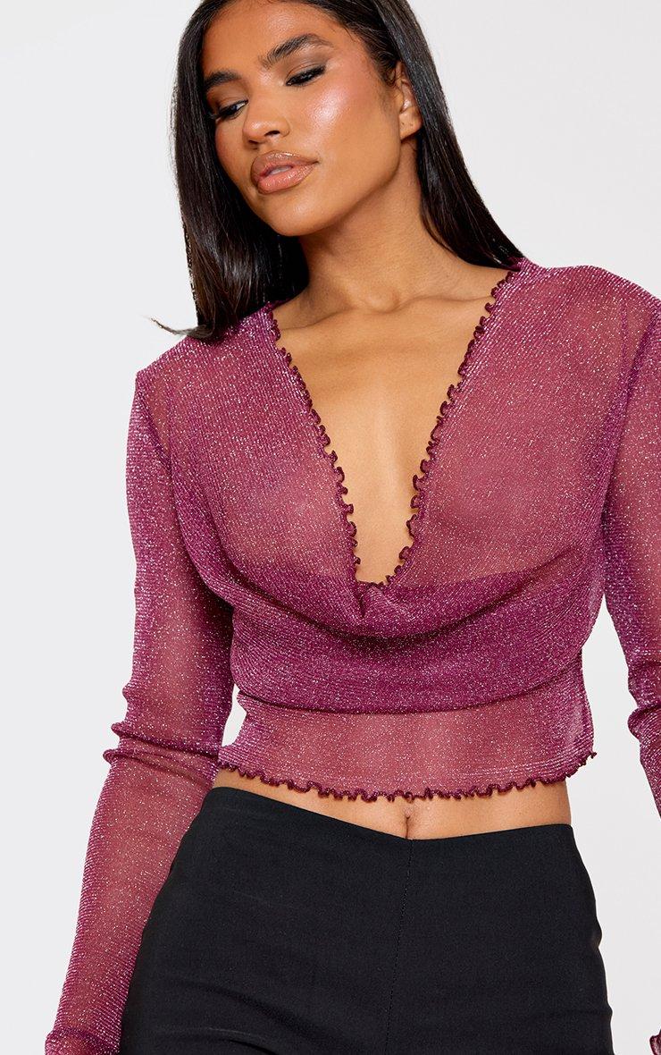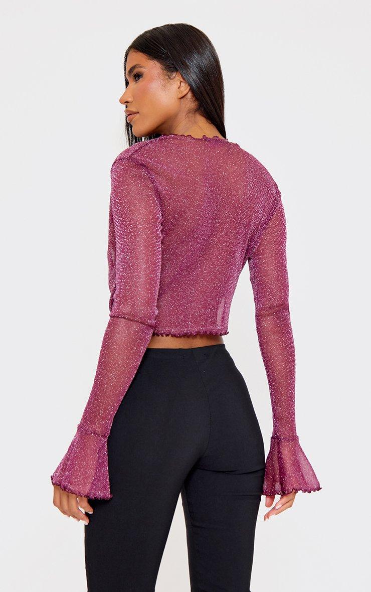 Flare Sleeve Cowl Neck Top In Purple Mesh