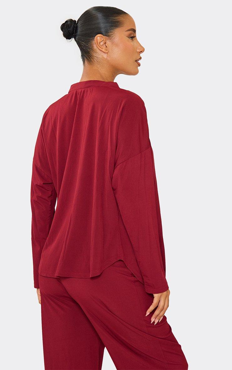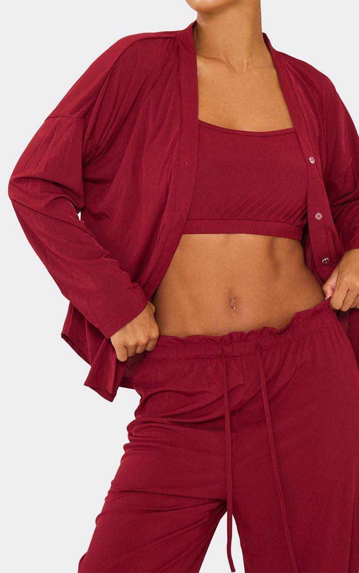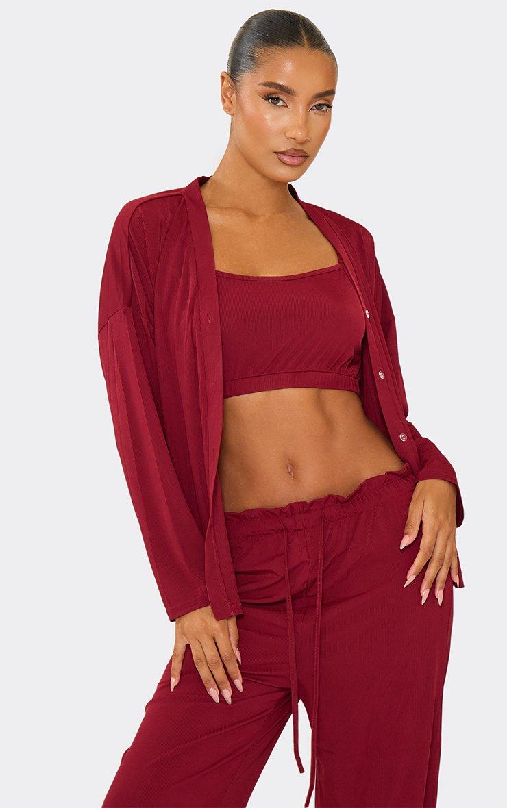 Long Sleeve Shirt And Wide Leg Trouser 3 Piece Pyjama Set In Burgundy