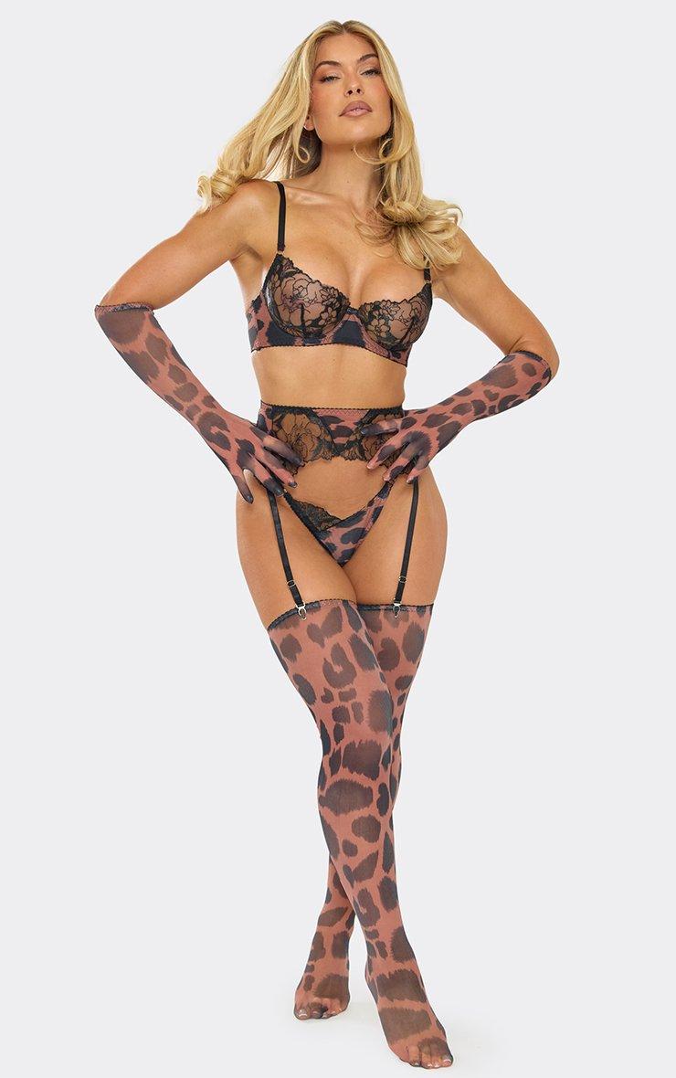 Leopard Print Satin Detail 3 Piece Lingerie Set In Brown