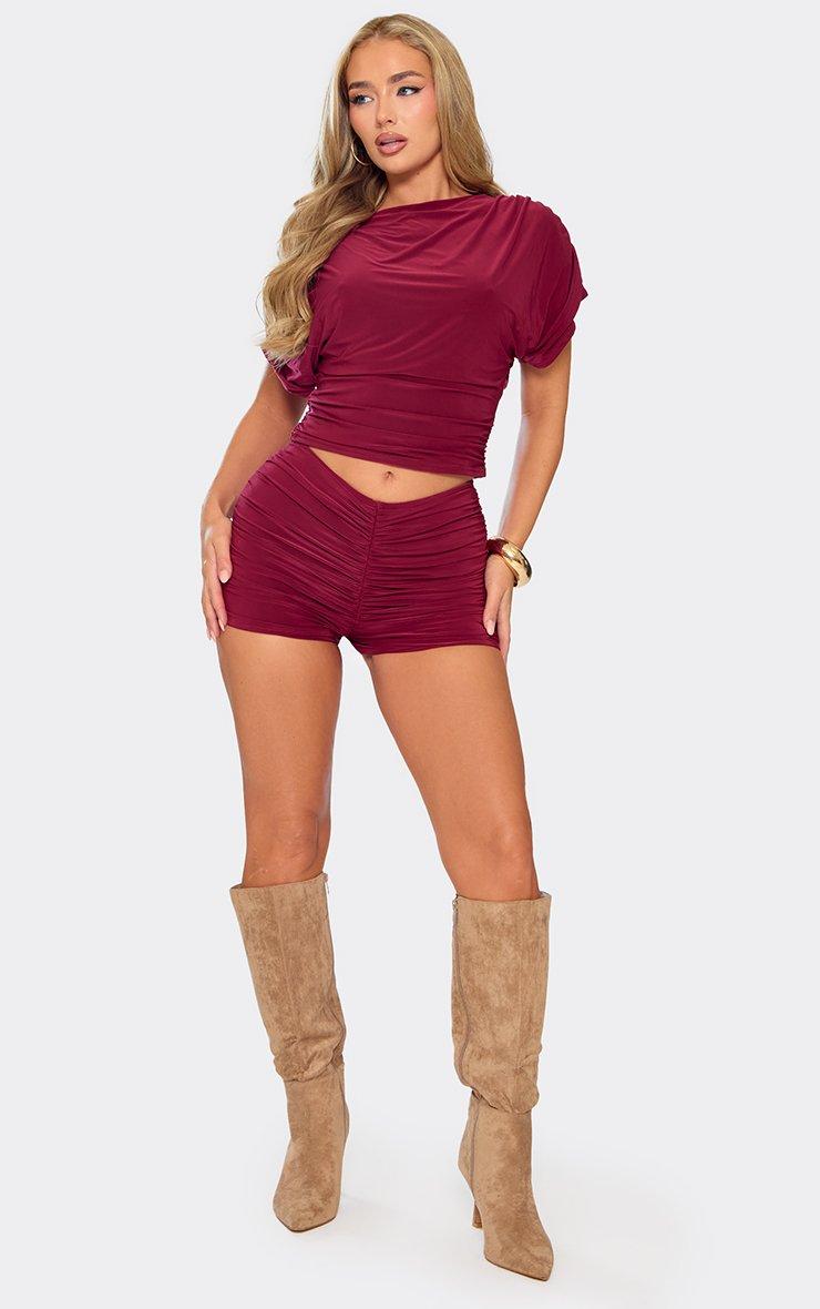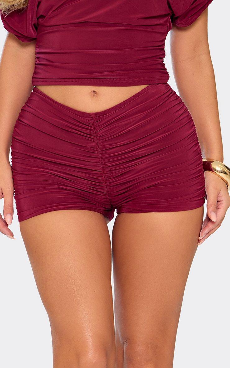 Low Rise Ruched Hot Pants In Burgundy Slinky