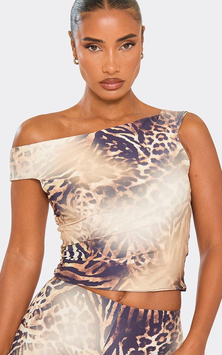 Long Sleeve Asymmetric Neck Crop Top In Multi Abstract Animal Print