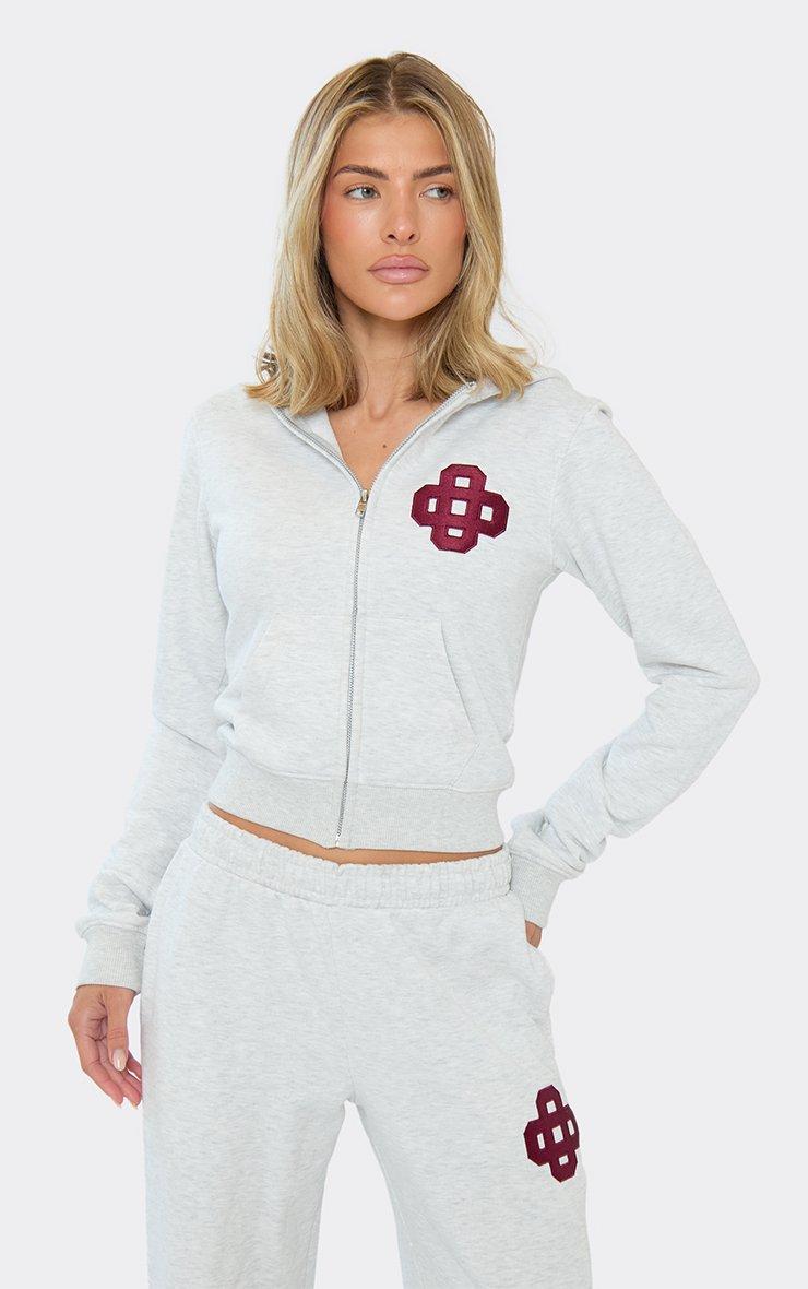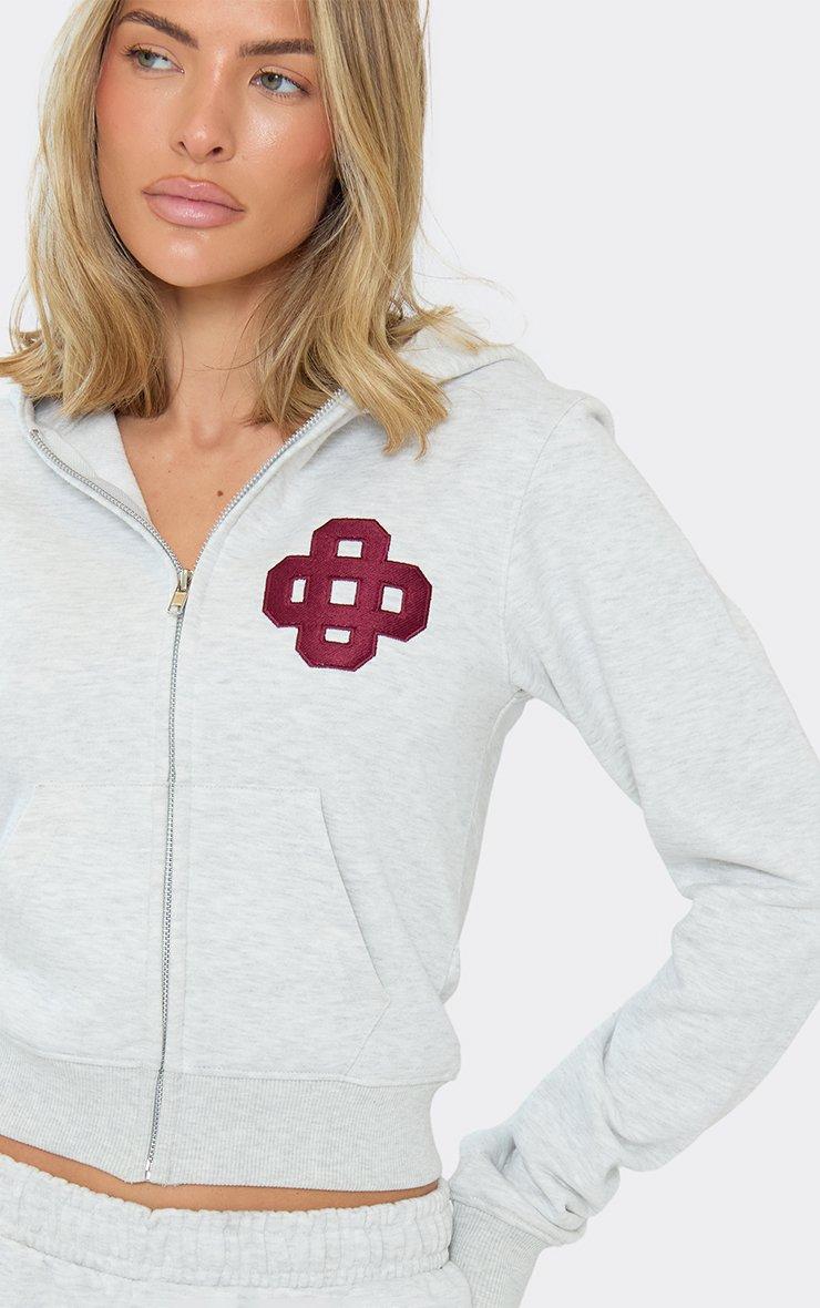 long sleeve zip up embroidered swirl logo hoodie in light grey marl
