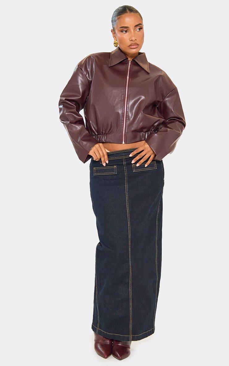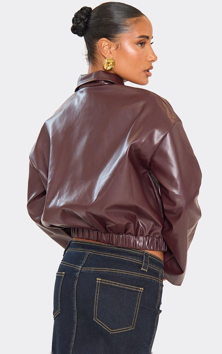 Long Sleeve Collared Detail Zip Down Bomber Jacket In Burgundy Faux Leather