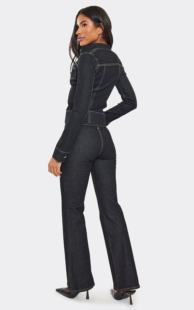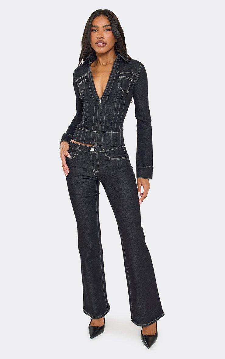 Low Rise Seam Detail Flared Jeans In Black Denim