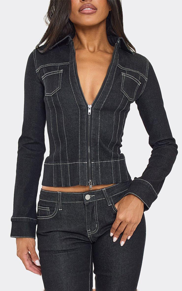 Long Cuffed Sleeve Zip Up Front Cropped Jacket In Indigo Denim
