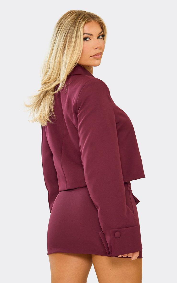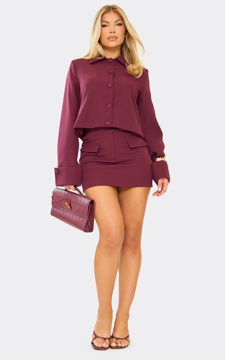 Long Sleeve Button Detail Cinched Waist Collared Top In Plum