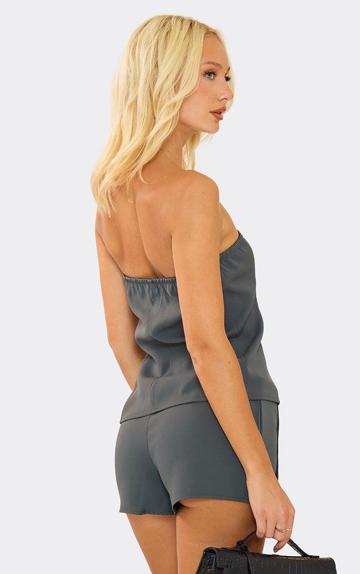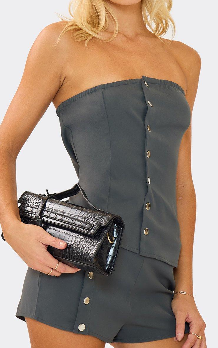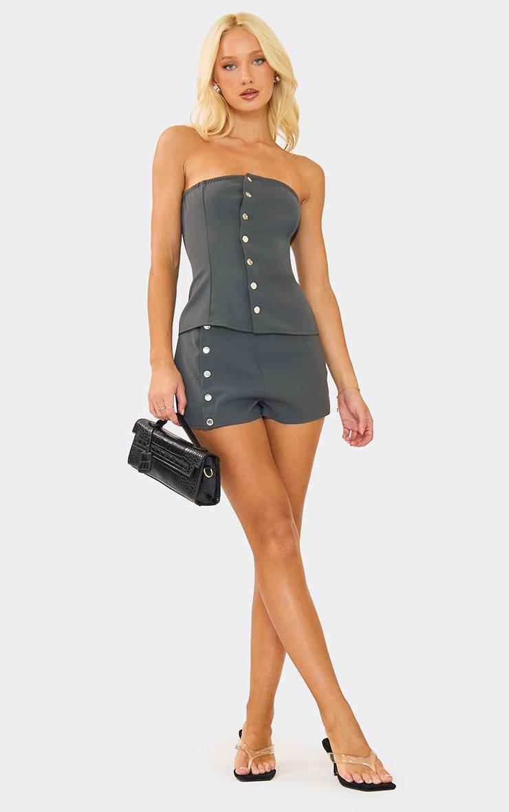 mid rise popper front hot pant shorts in charcoal grey