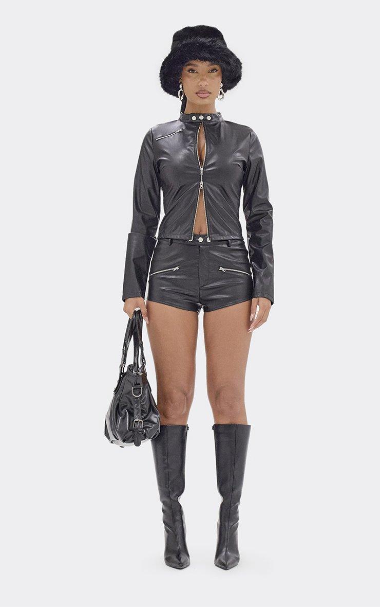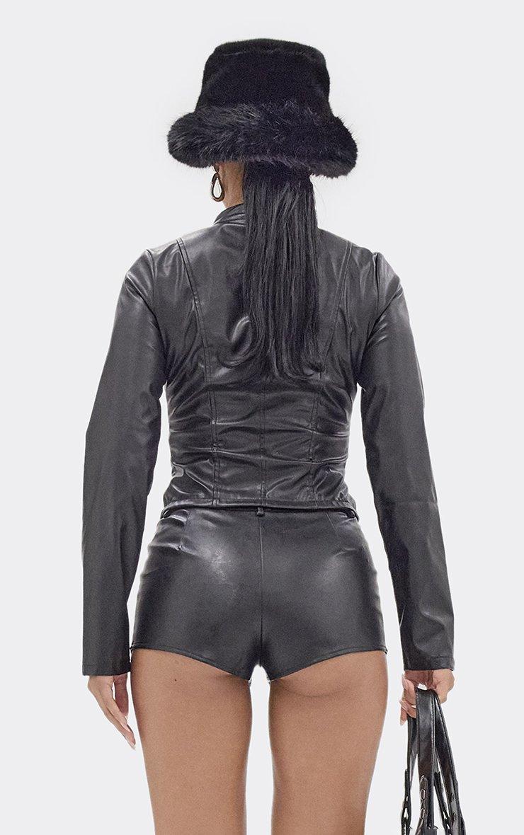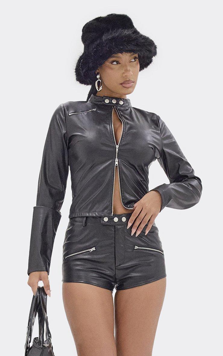 Long Sleeve Zip Up Fitted Jacket In Black Faux Leather