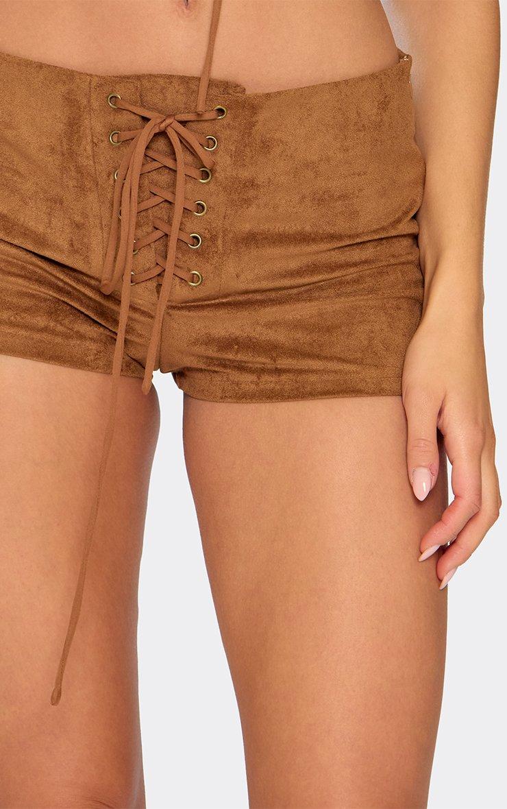Mid Rise Lace Up Front Shorts In Brown Faux Suede