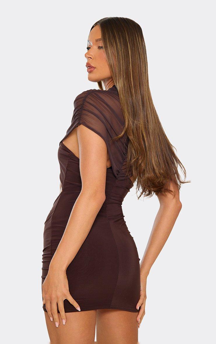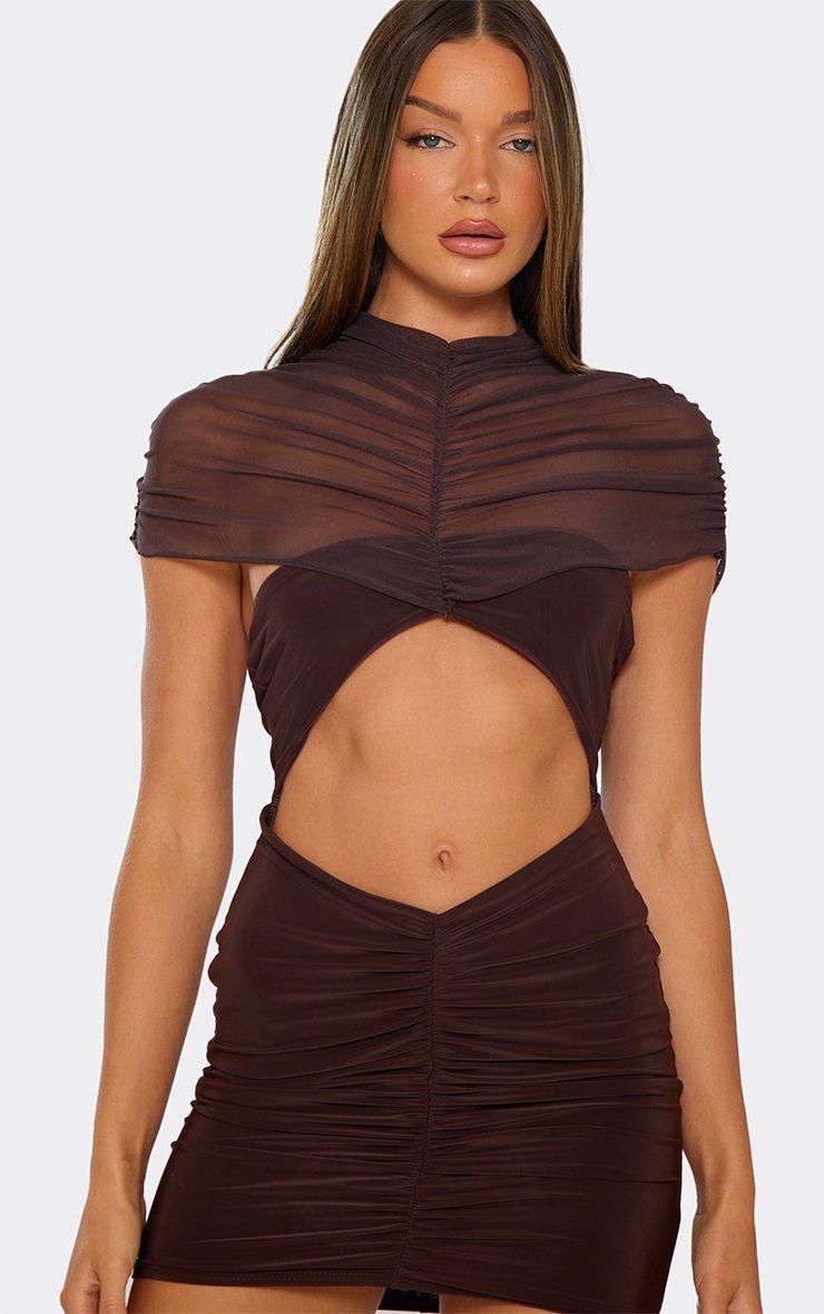 High Neck Mesh Overley Cut Out Ruched Detail Mini Dress In Chocolate Brown