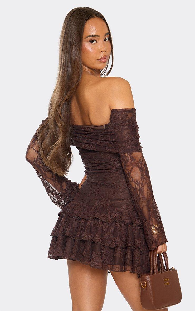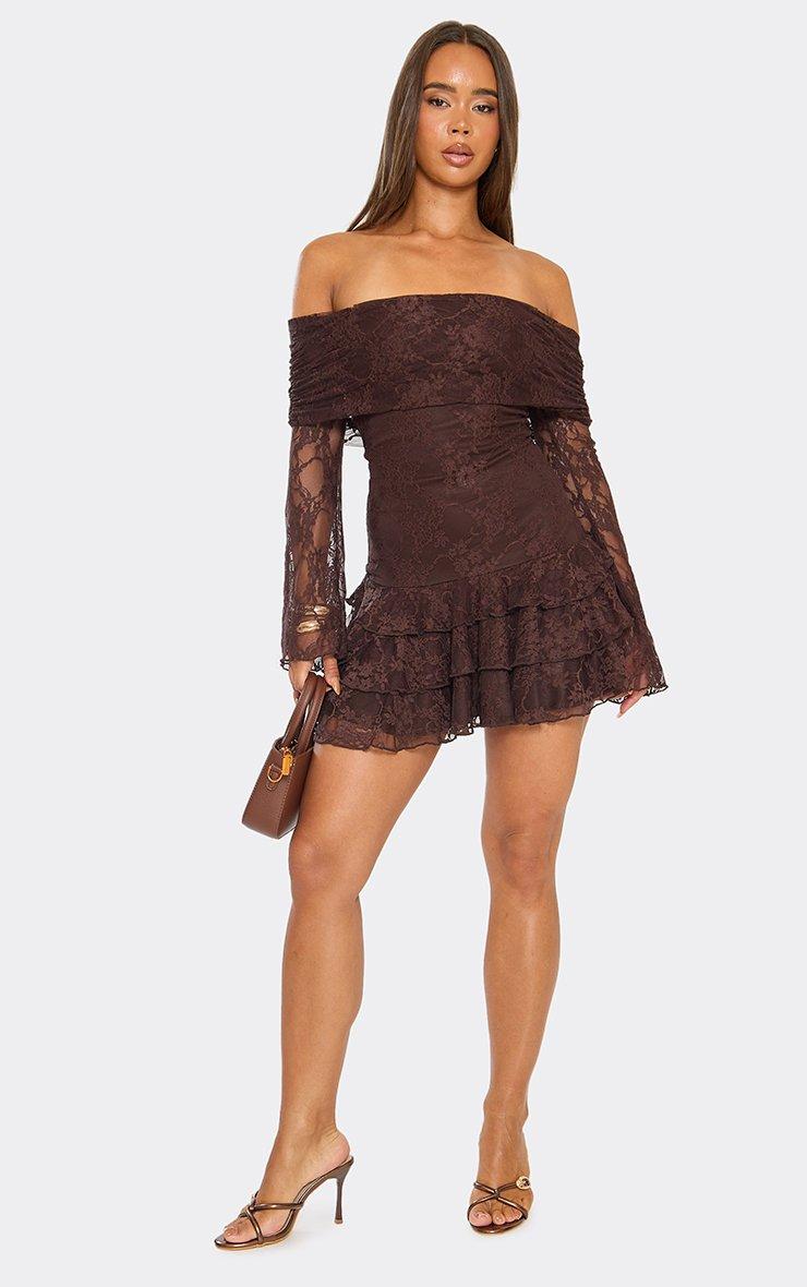 Long Sleeve Bardot Fold Over Ruffle Mini Dress In Chocolate Brown Lace