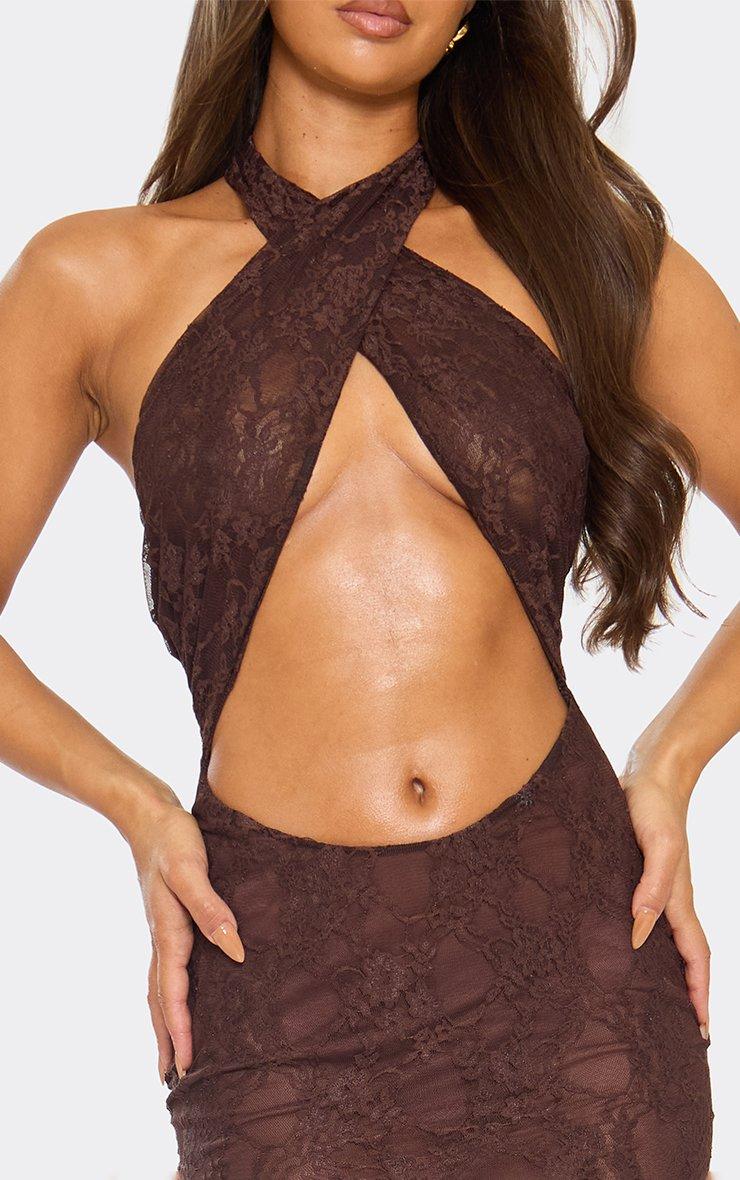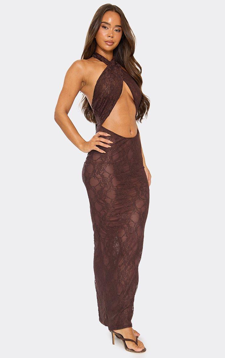 Halterneck Cross Over Cut Out Front Detail Maxi Dress In Chocolate Brown Lace
