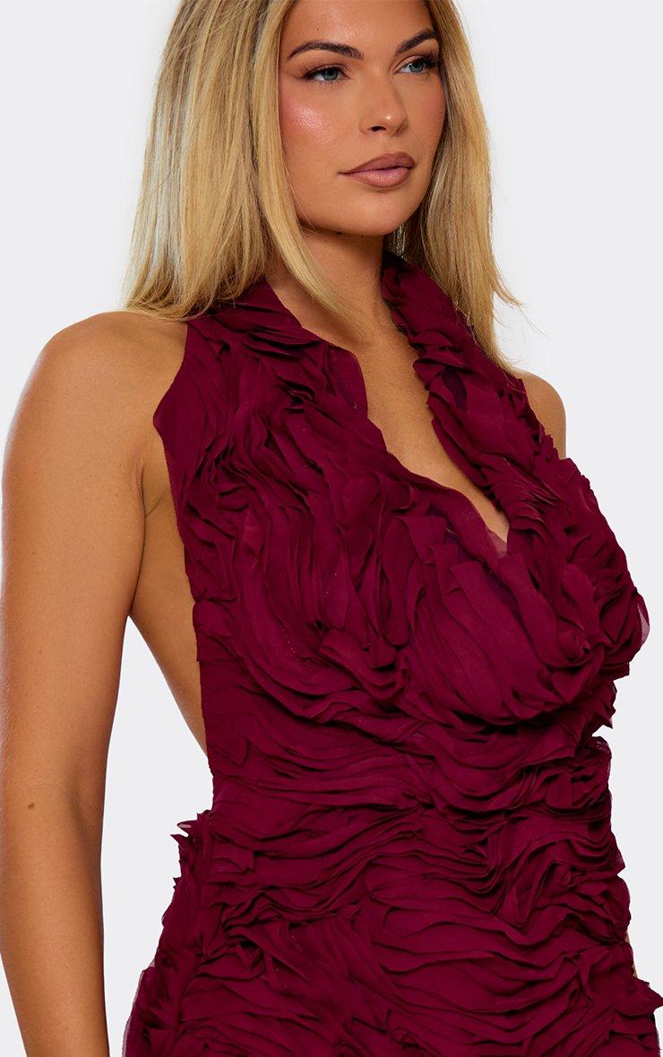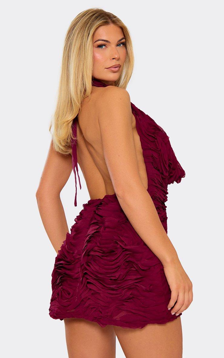Cowl Neck Open Back Detail Mini Dress In Burgundy Textured
