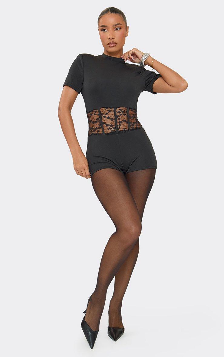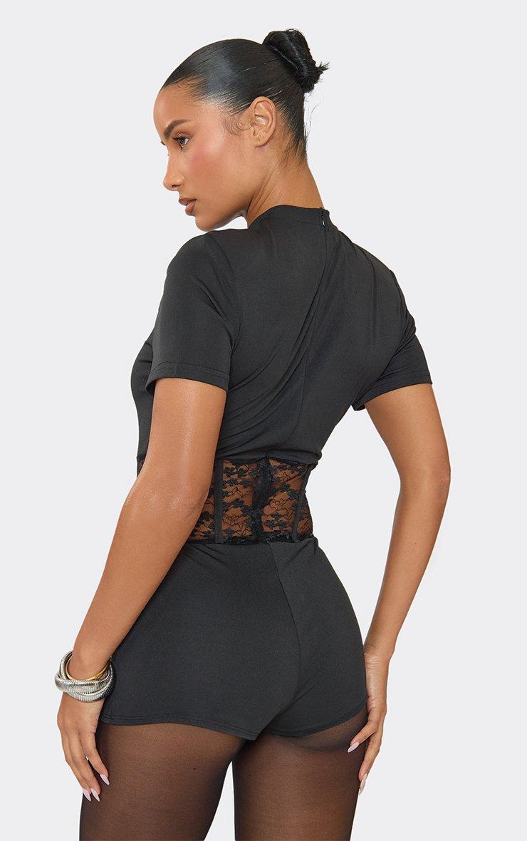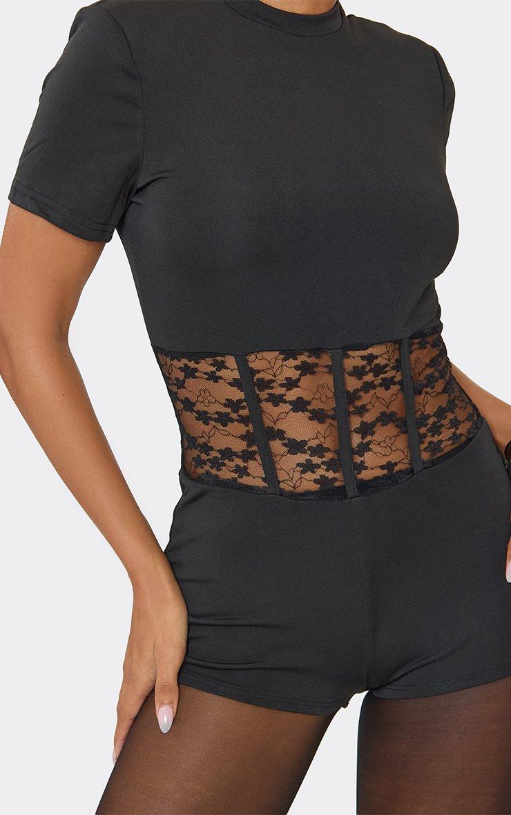 Short Sleeve Contrast Lace Boning Detail Playsuit In Black
