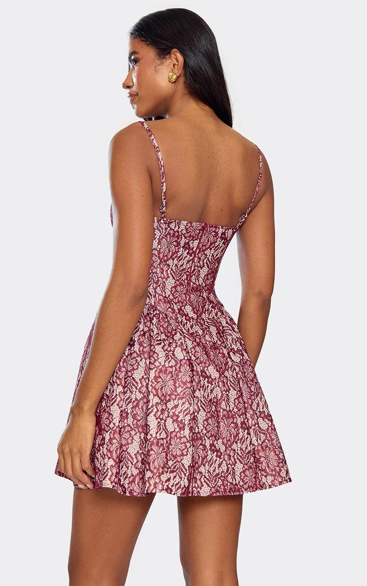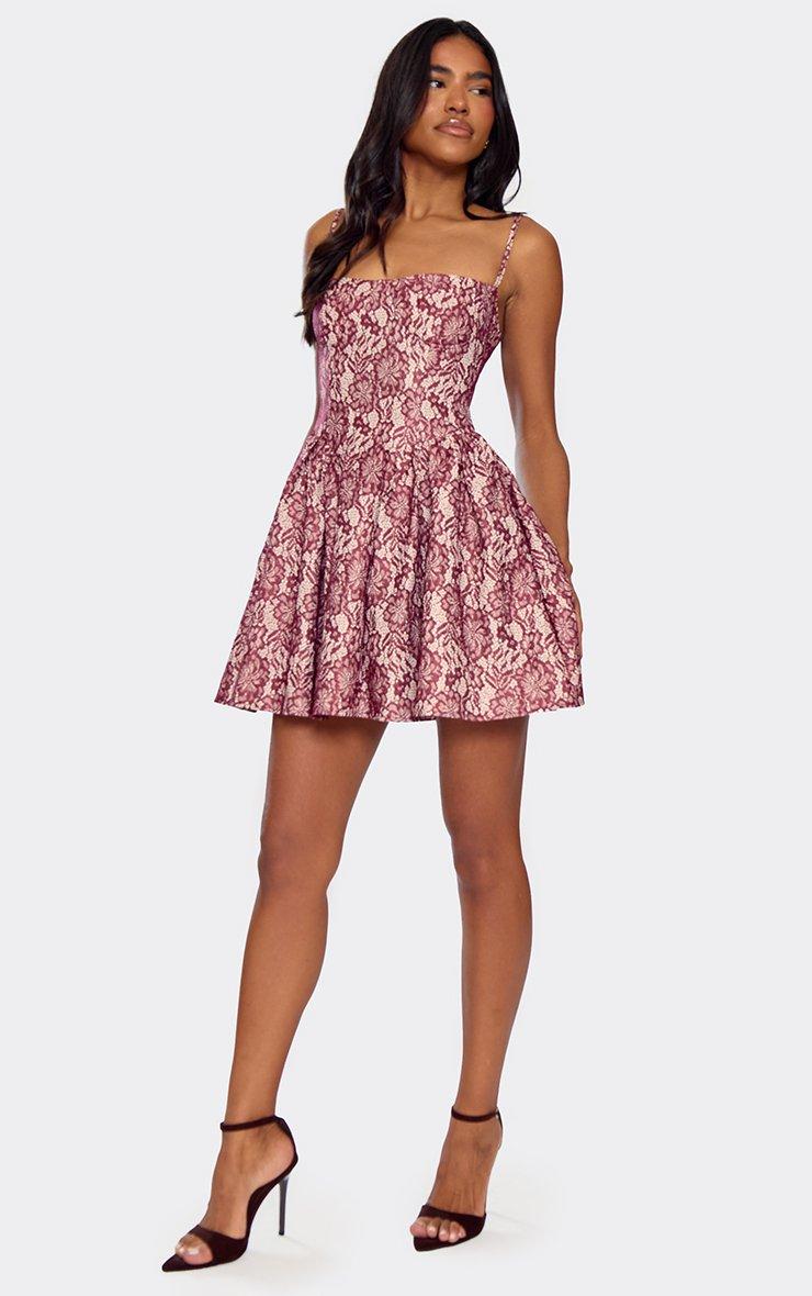 Strappy Tailored Skater Mini Dress In Burgundy Lace