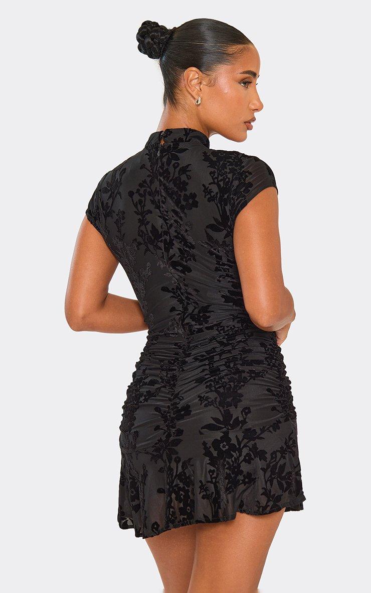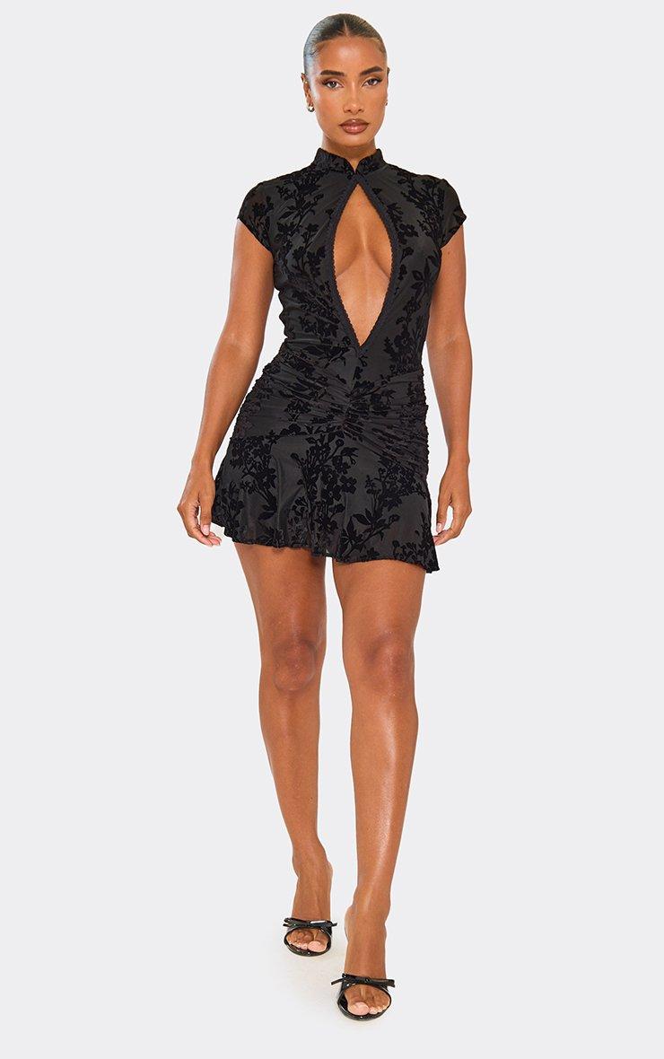 Keyhole Cut Out Ruched Detail Flippy Hem Mini Dress In Black Devore