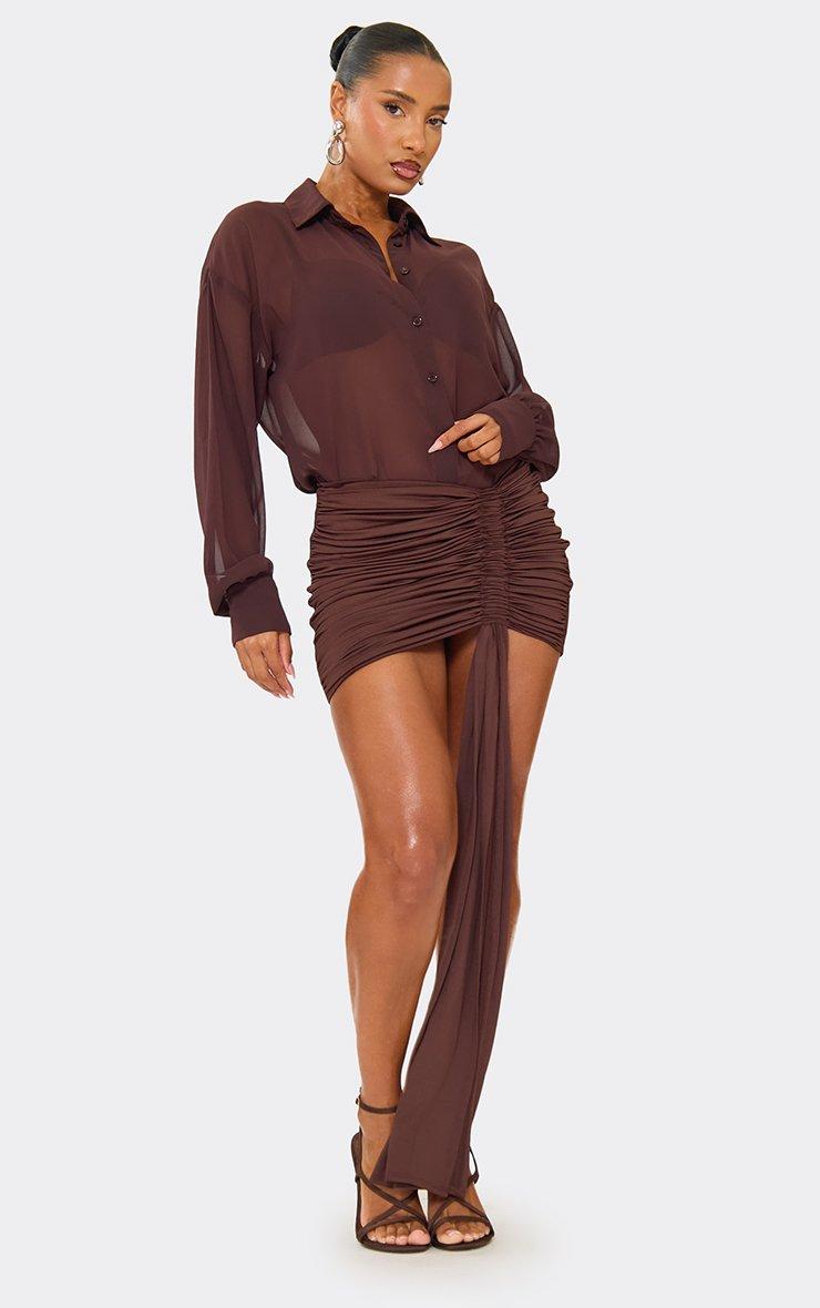 Mid Rise Ruched Drape Detail Mini Skirt In Chocolate Brown Slinky