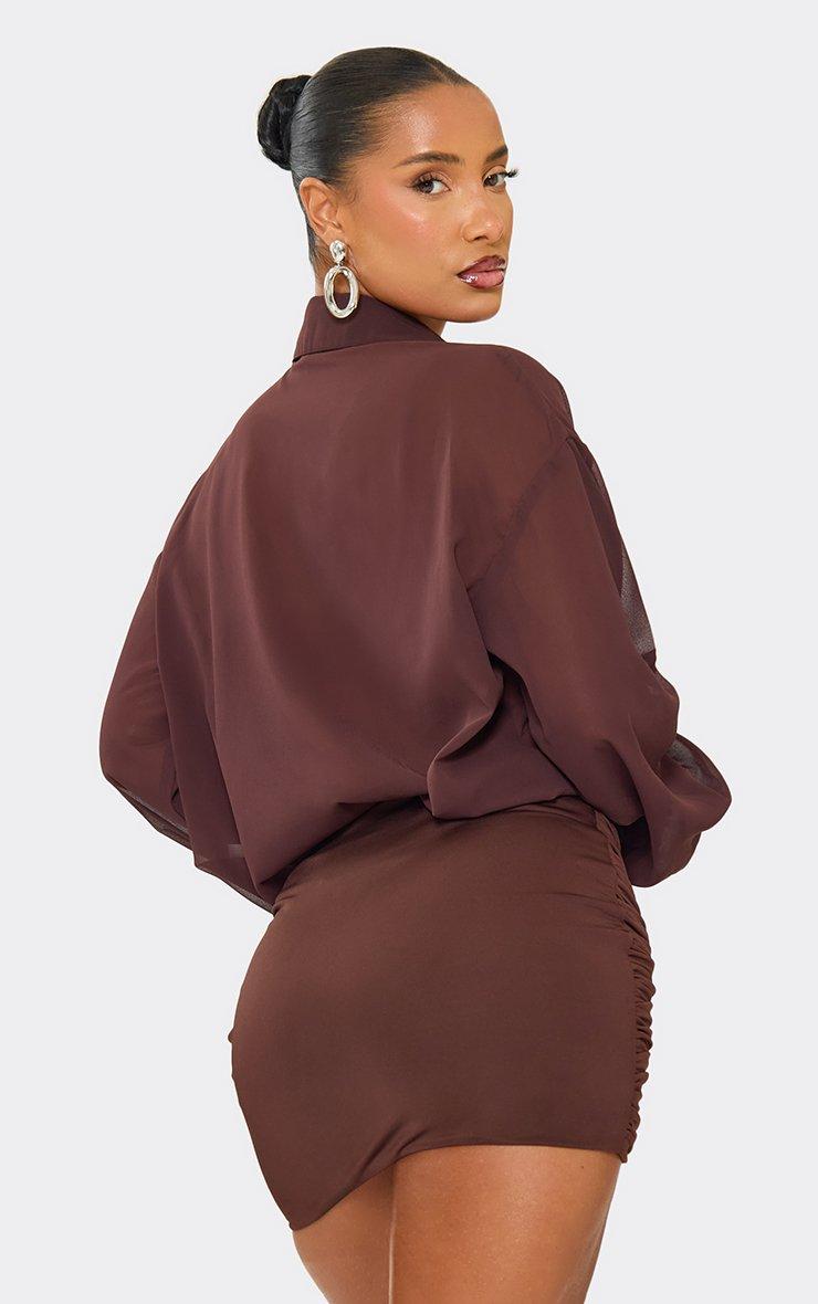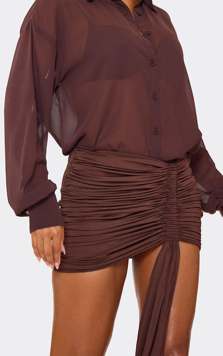 mid rise ruched drape detail mini skirt in chocolate brown slinky