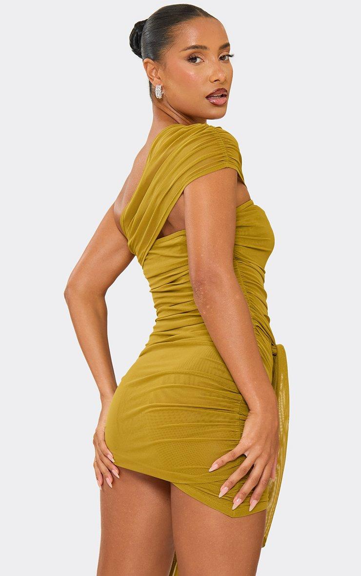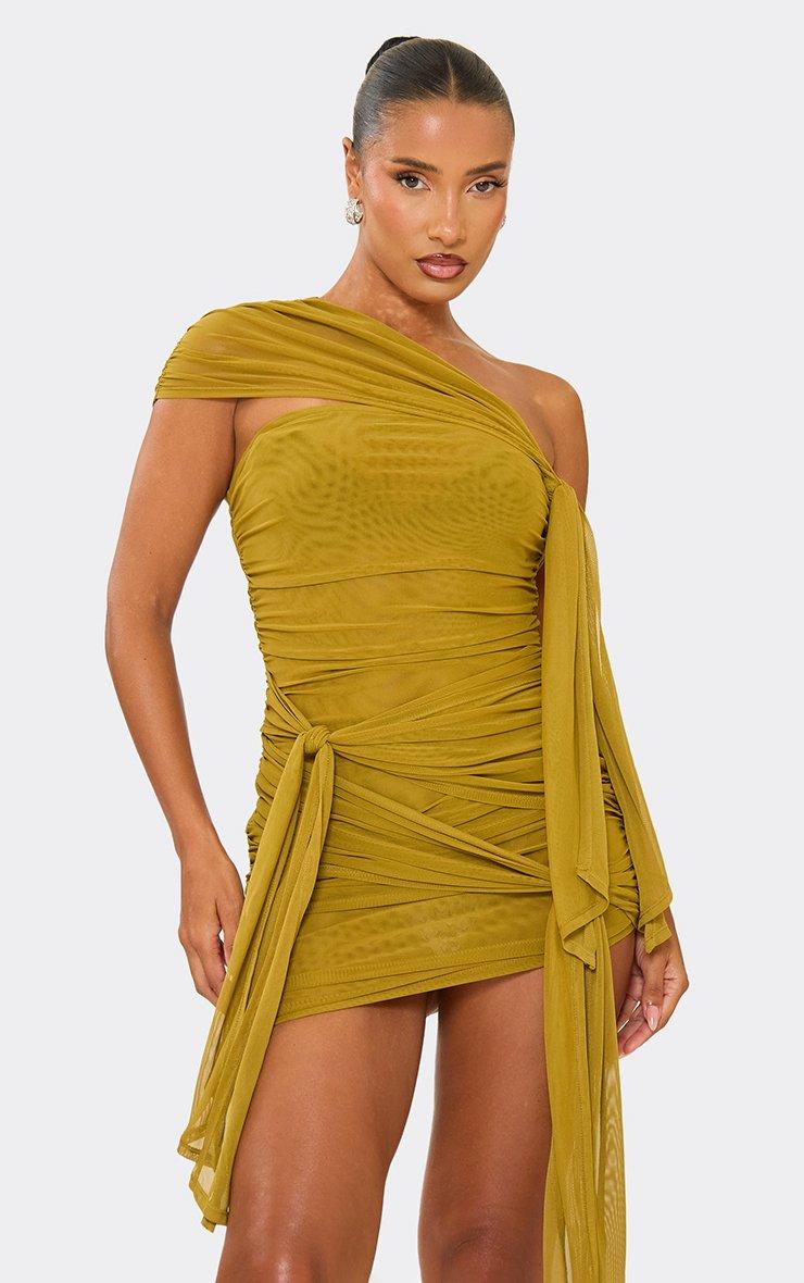 One Shoulder Knot Drape Detail Mini Dress In Olive Green Mesh