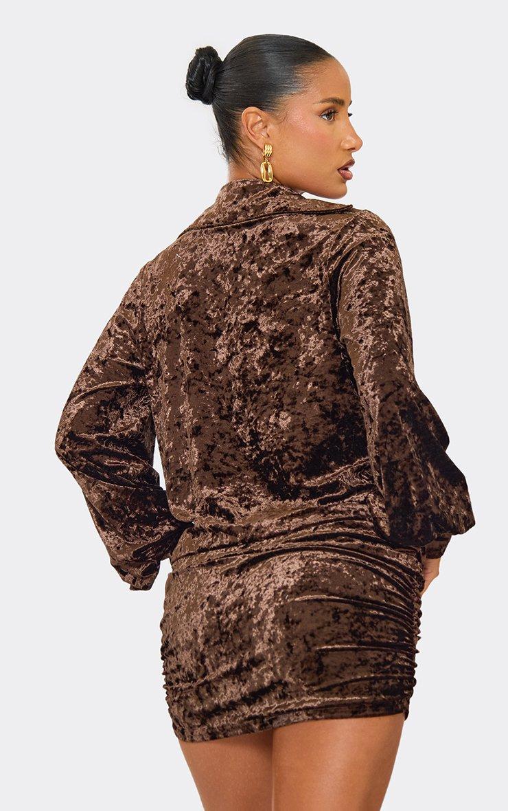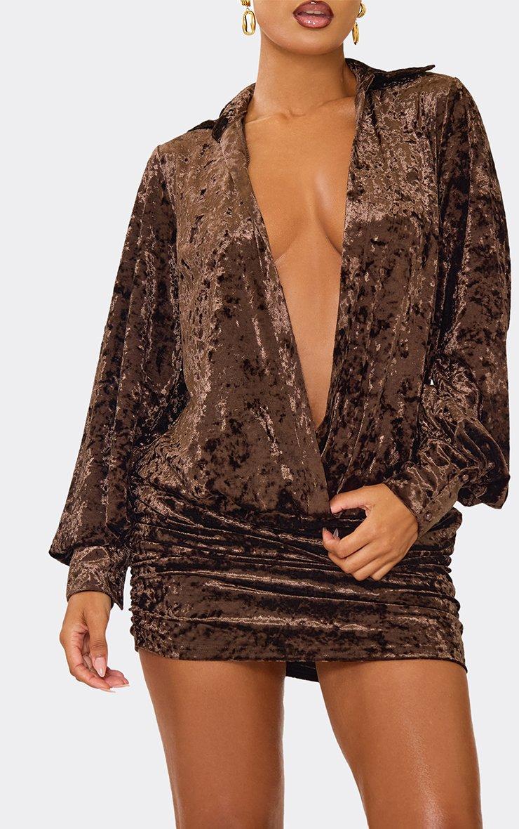 Long Sleeve Plunge Blouson Mini Dress In Chocolate Brown Velour