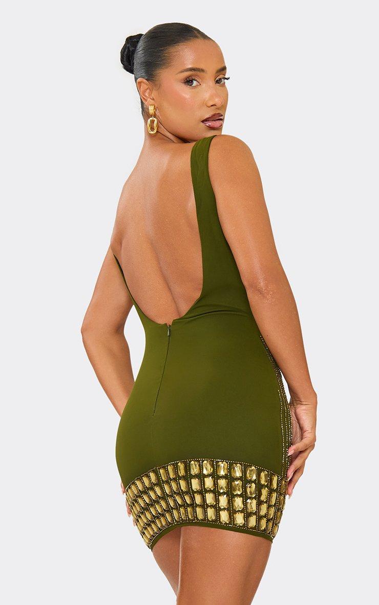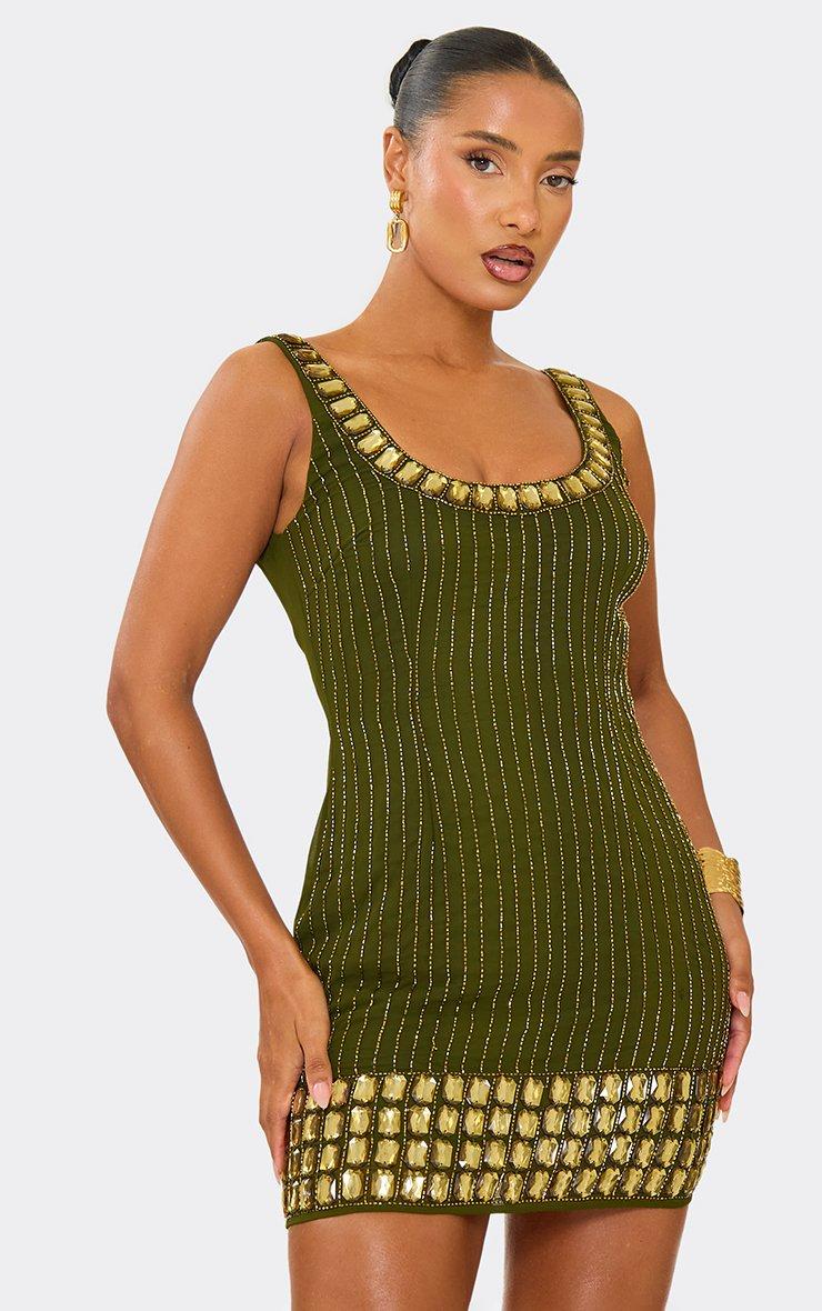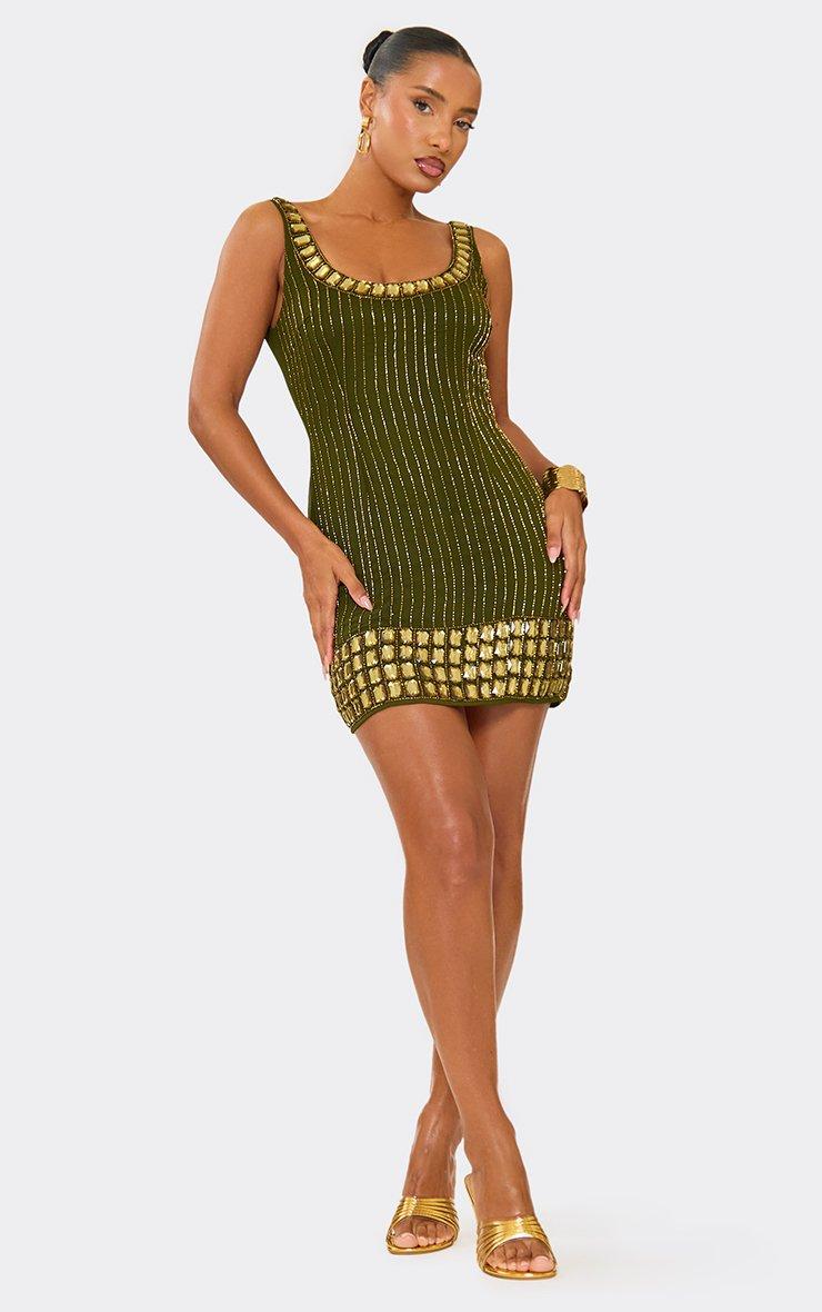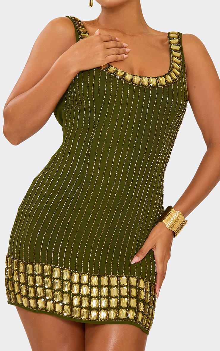Scoop Neck Gold Diamante Embellished Mini Dress In Khaki