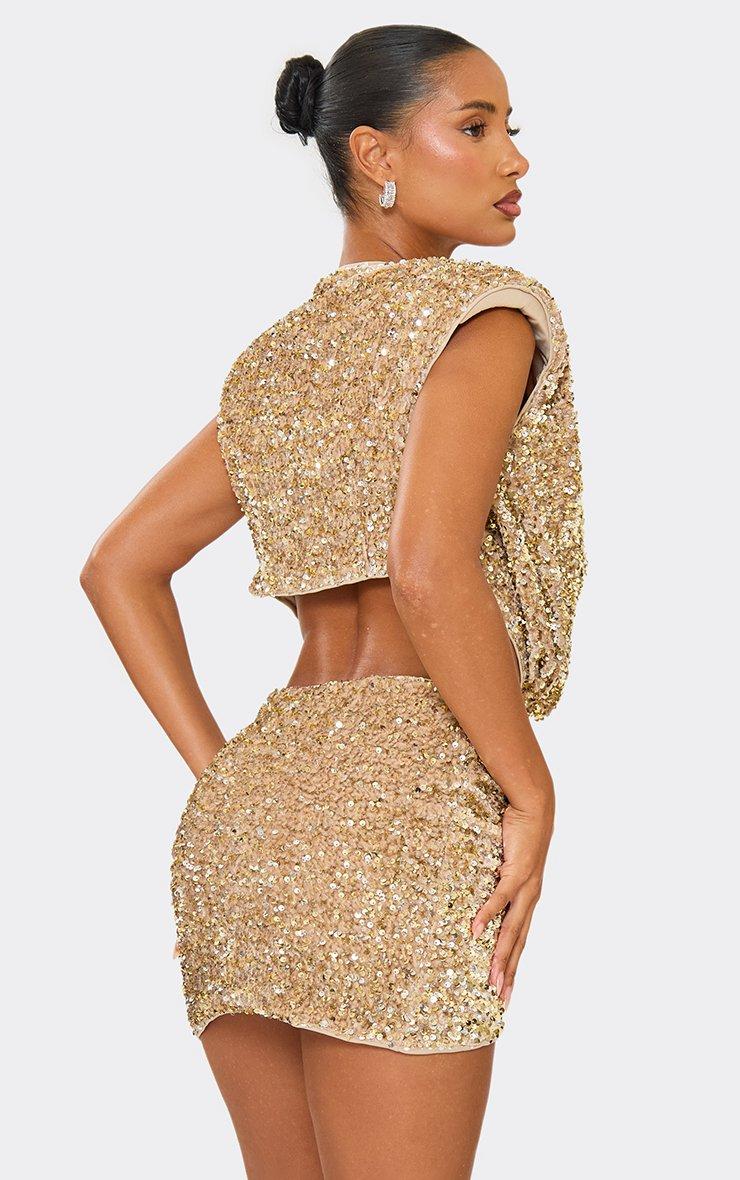 Cowl Neck Shoulder Pad Detail Top In Champagne Velour Sequin