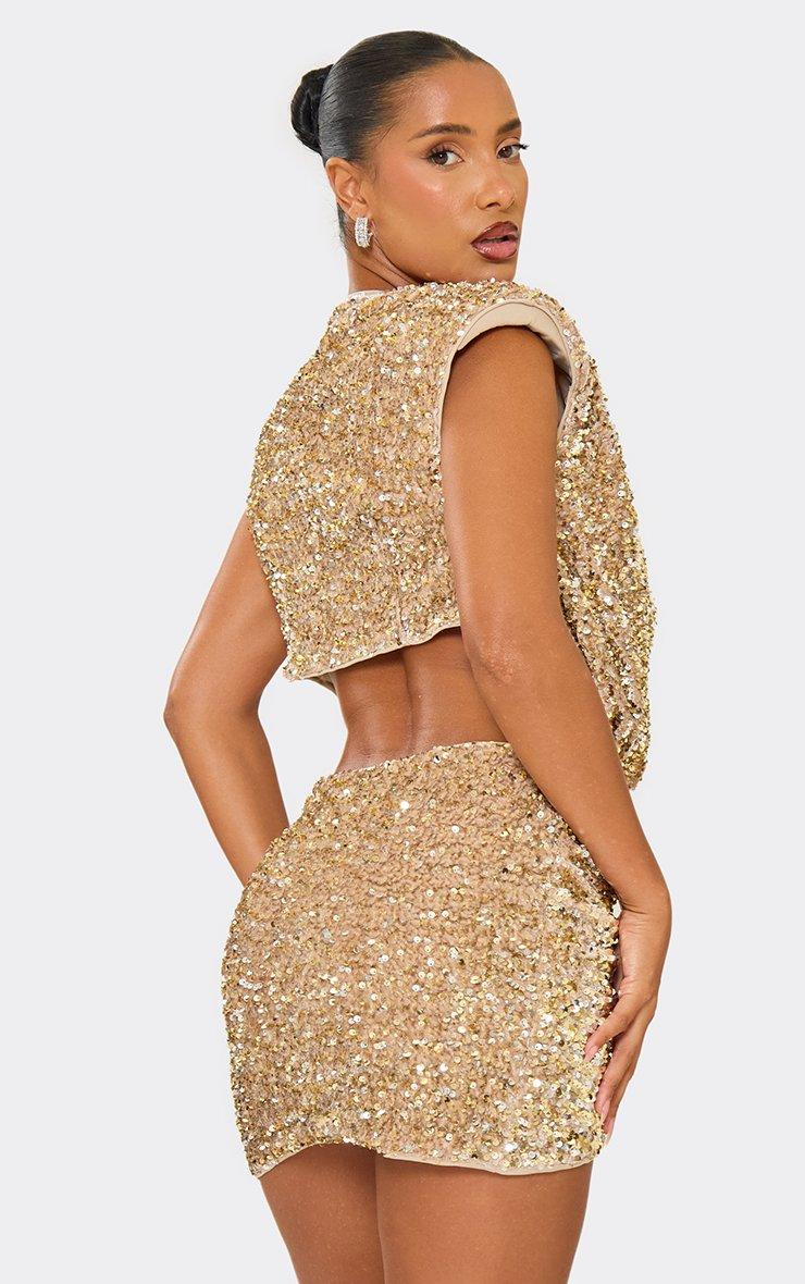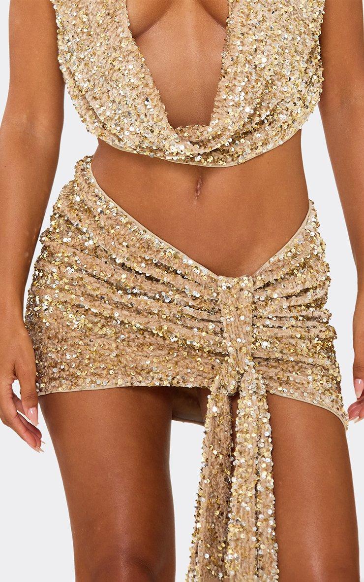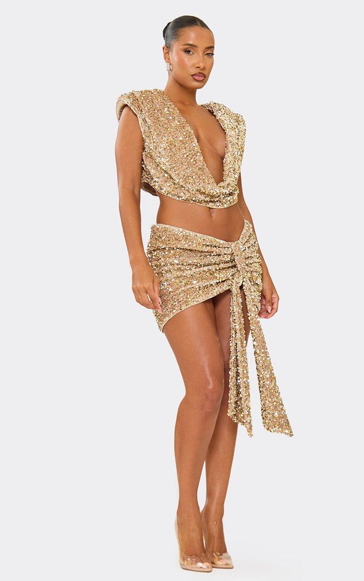 Low Rise Ruched Drape Detail Mini Skirt In Champagne Velour Sequin