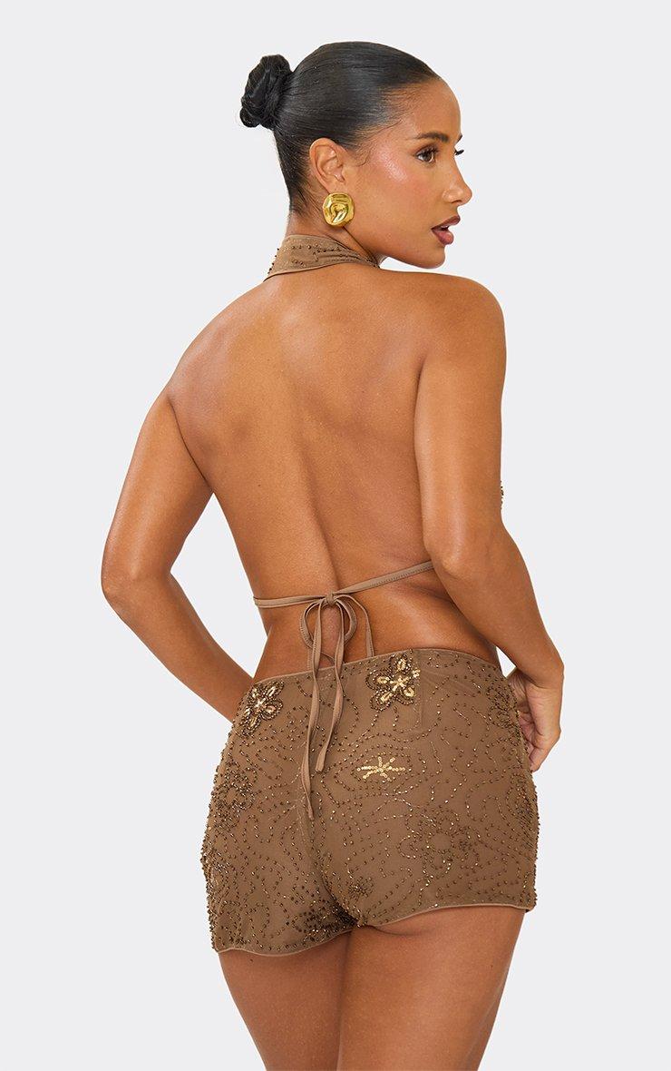 Cowl Neck Bead Embellished Tie Back Top In Brown