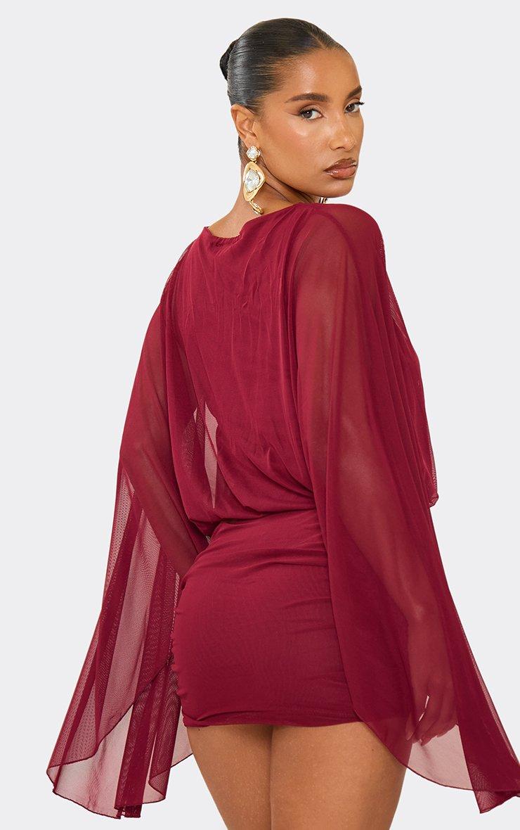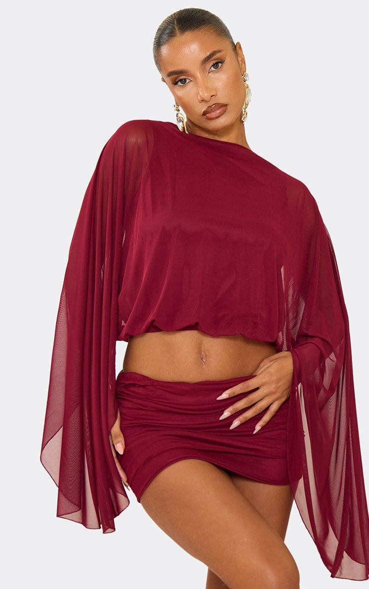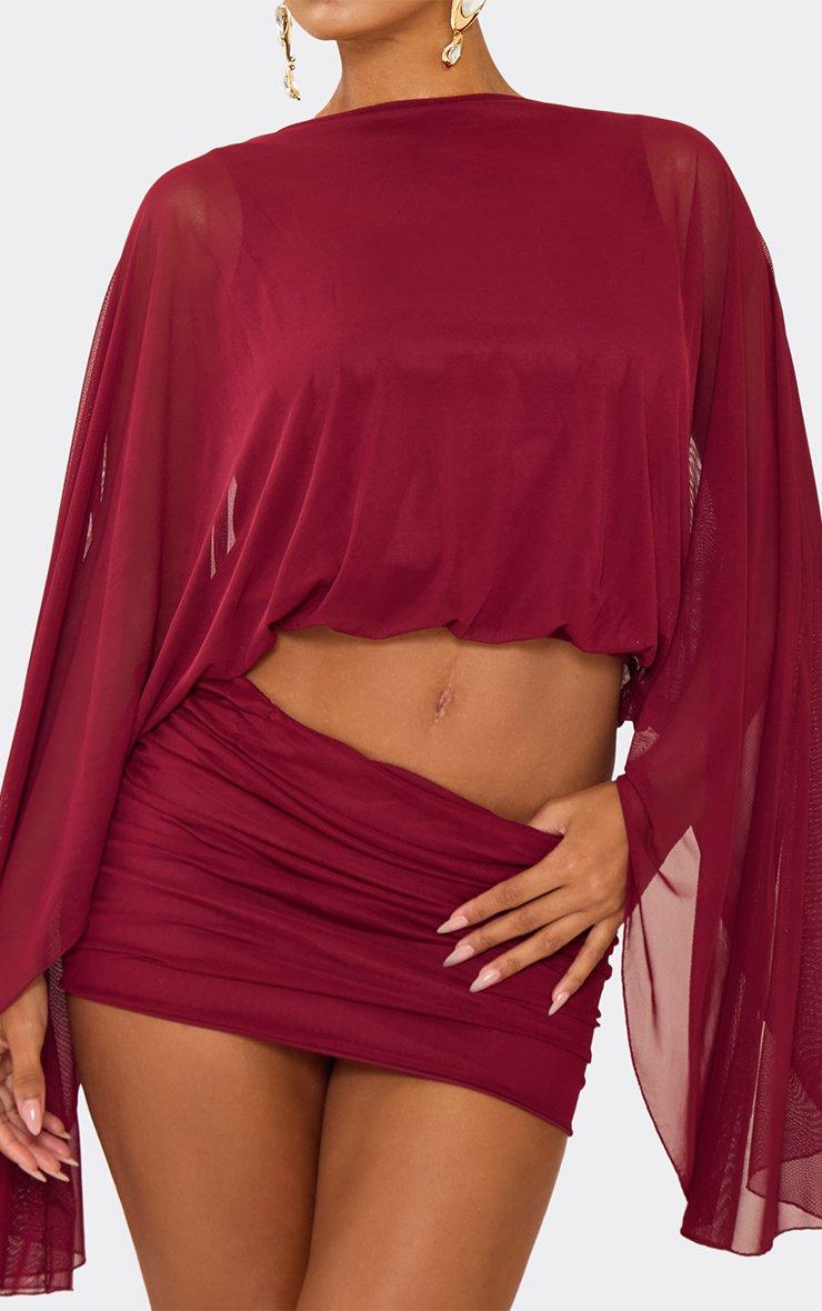 Floaty Drape Sleeved Cape Top In Burgundy Mesh