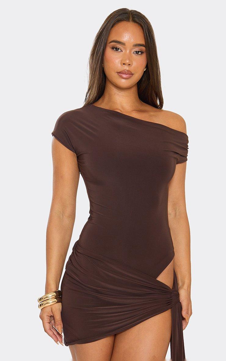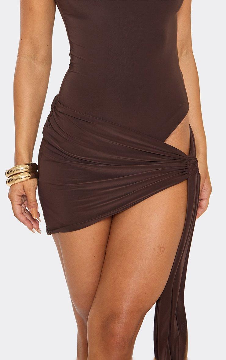Low Waist Drape Detail Mini Skirt In Brown Slinky