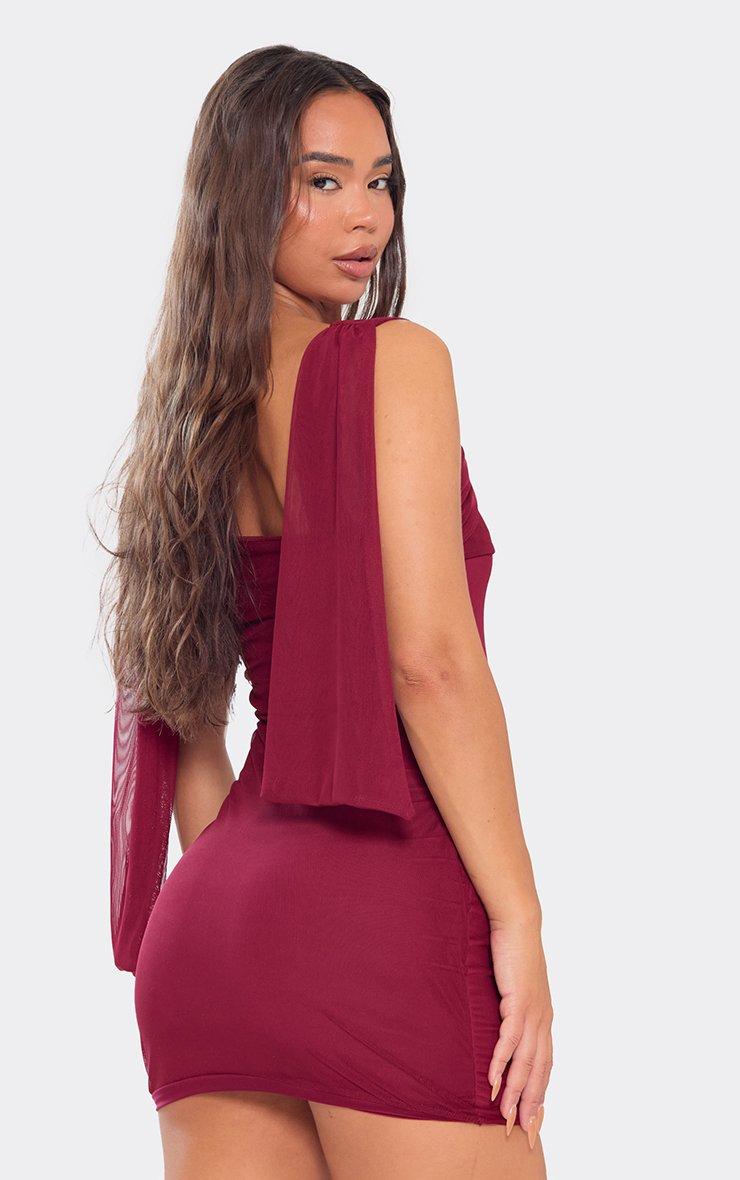 Mesh Cape Overlay Ruched Detail Mini Dress In Burgundy